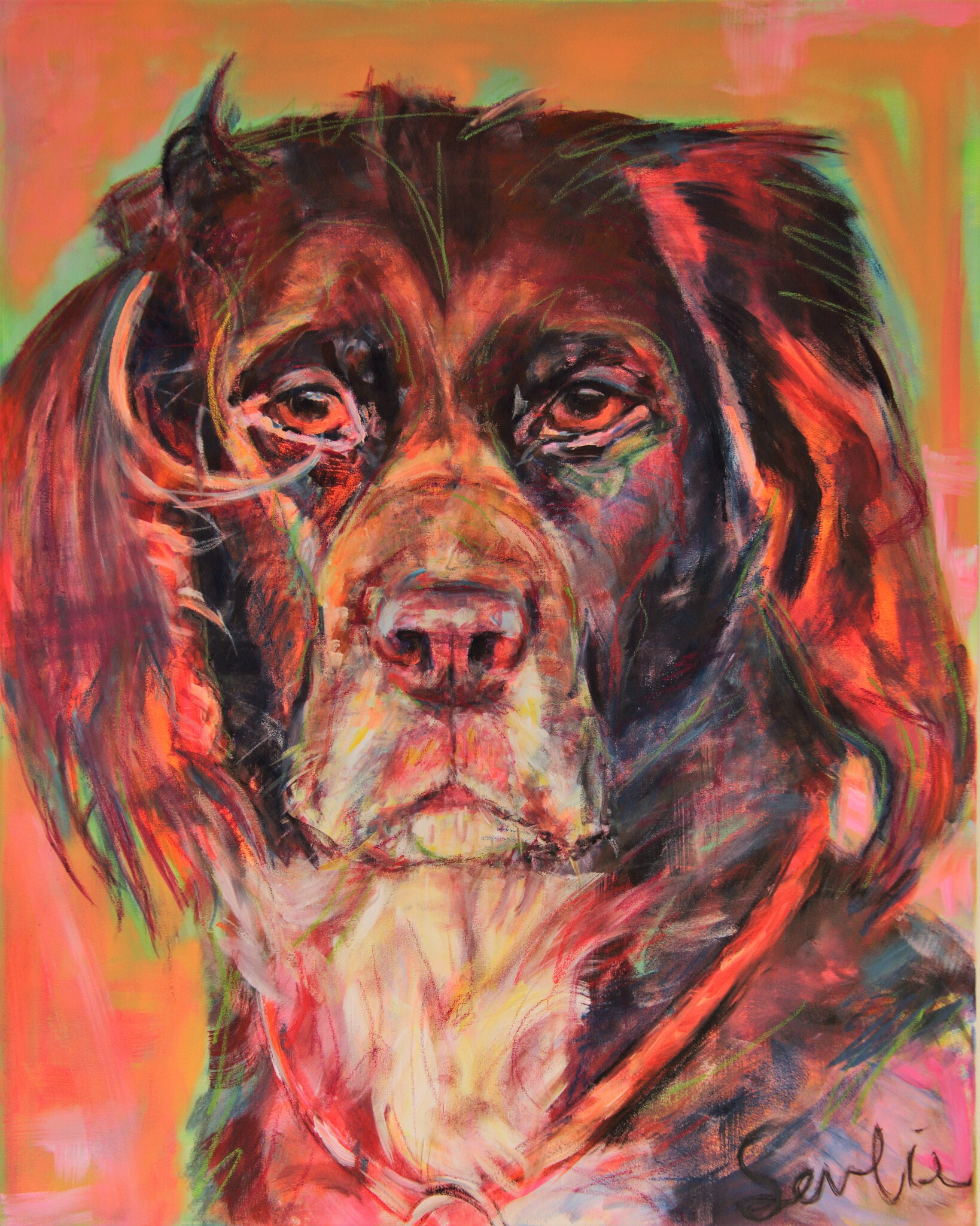 Portret Huisdier Hond Dieren Opdracht Schilderij Kunstkaart Heidewachtel Münsterländer Kleur Vrolijk