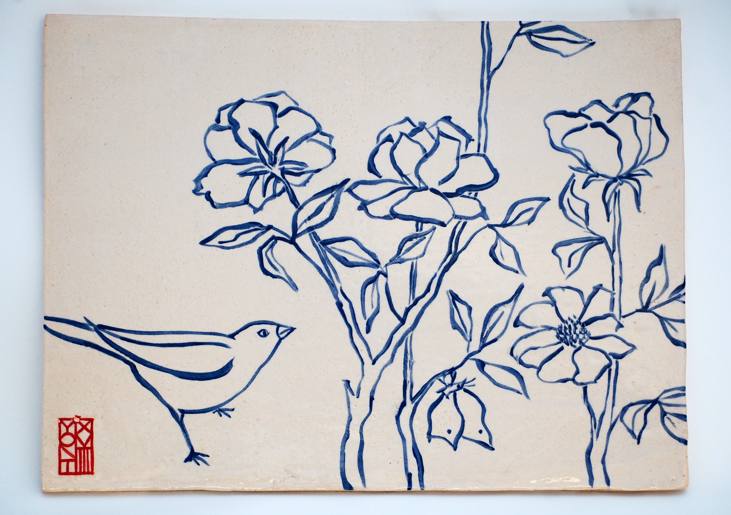 handgevormde tegel met rozen en een vogel