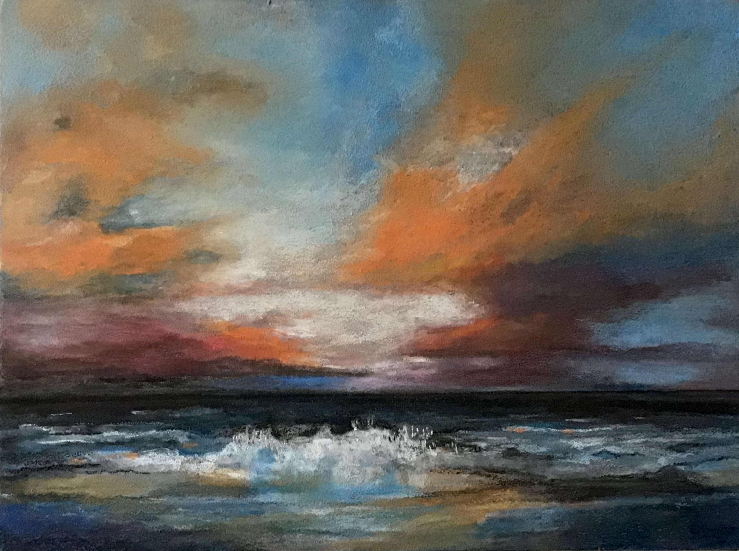 Ondergaande zon bij Verklikkerstrand, pastelkrijt 2019.