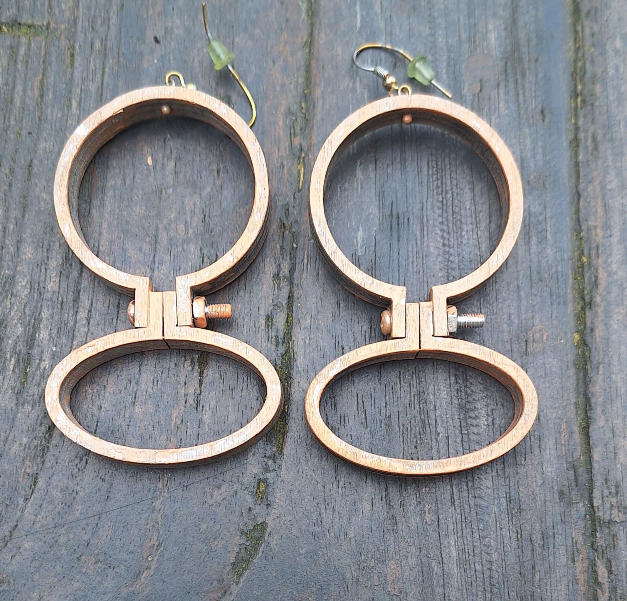 Oorbellen gemaakt van hout met schroefjes van recycle materiaal. Voorkant is licht van kleur en de zijkant is donkerbruin