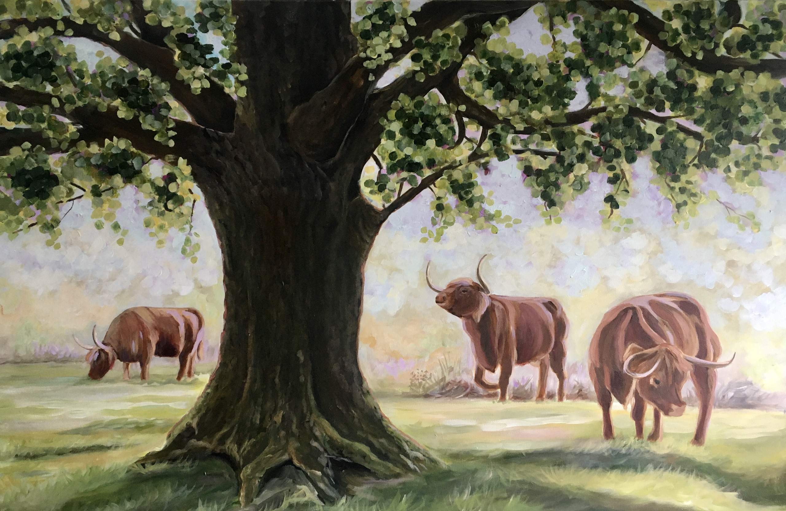 Schilderij Groen Dieren Hooglander Natuur Bomen Acrylverf Koeien Boom Schotse Rust Voorjaar Hooglanders Natuurlijk Bossen Landelijk Doorkijkje Ochtendlicht Dauw