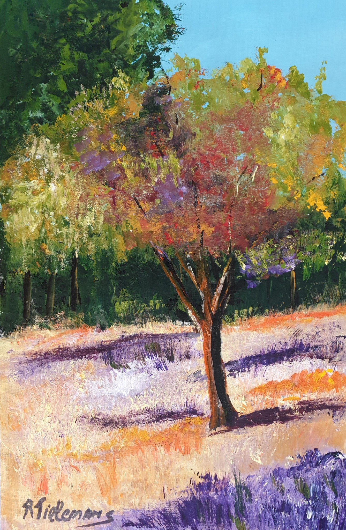 Paars Groen Bruin Papier Natuur Boom Acrylverfschilderij Provence Veelkleurig
