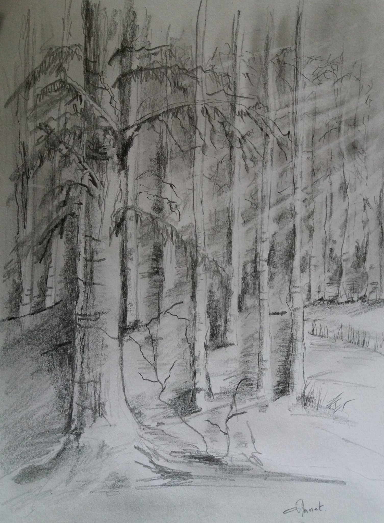 Tekening in zwart en grijzen met grafietstift en vulpotlood, ook veegtechniek