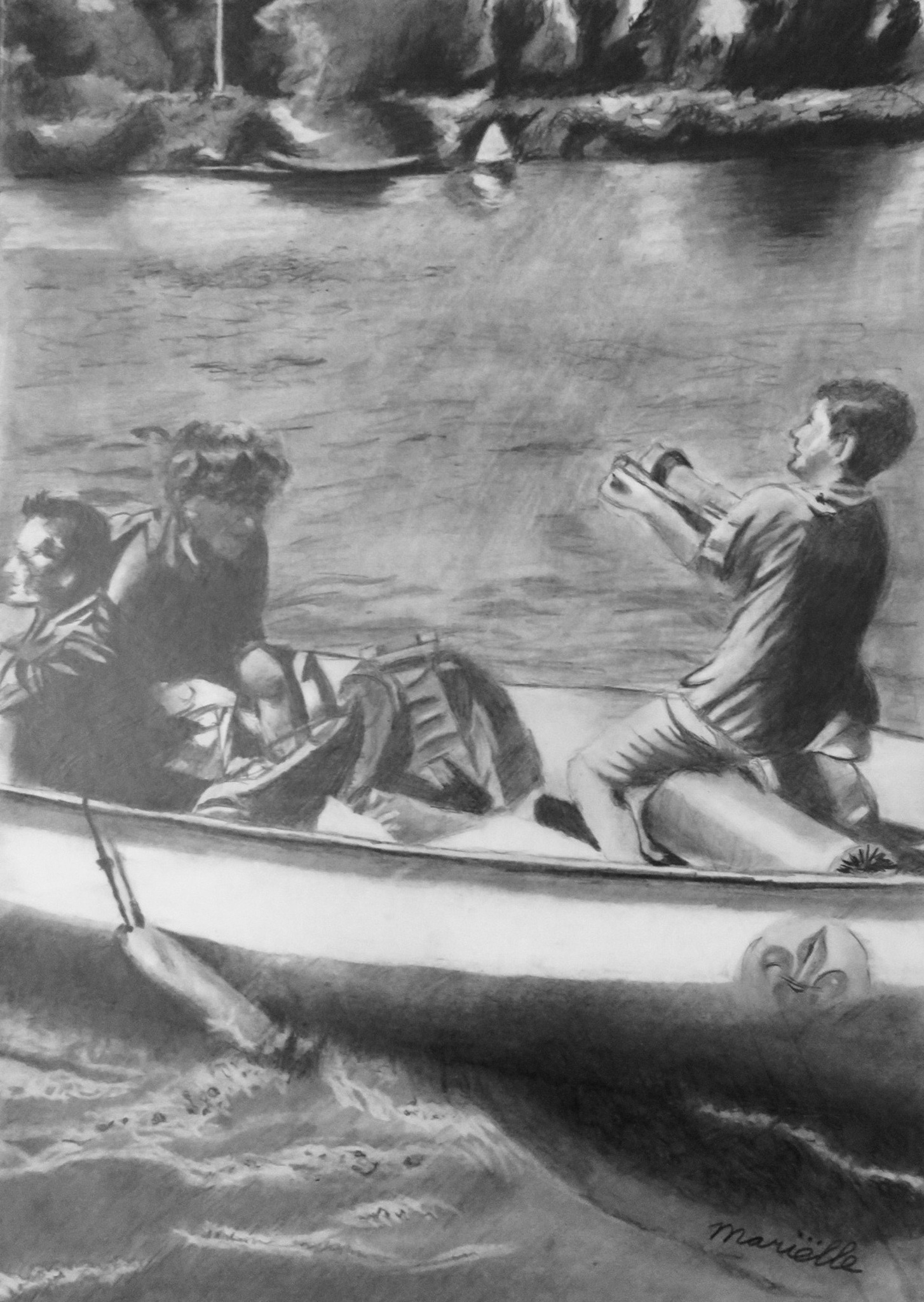 Deze tekening hoort bij de tekening van scouting. Deze jonge man schit met een waterpistool op zijn vriend. Ook deze tekening hoort bij de serie 'stilstaan bij een mooi moment' De heren varen op hun Ladyvlet naar Kaageiland. Ze hebben er heel veel plezier gehad vöör Corona