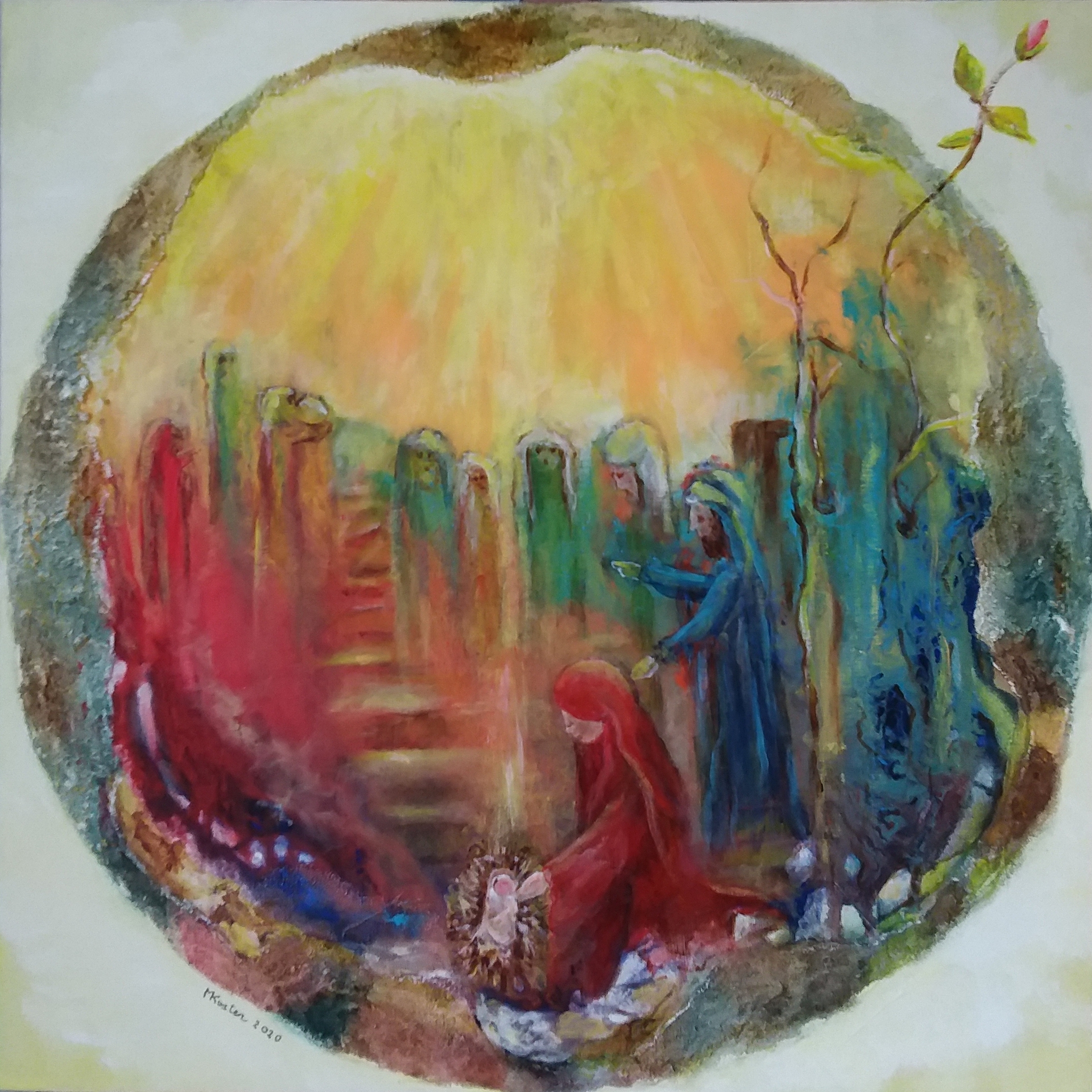 Intuïtief geschilderd. In fases te zien op Facebook bij "Schilderijen van Marian Koster" Een Kerstverhaal met belofte. Gevernist en compleet met zwarte baklijst.