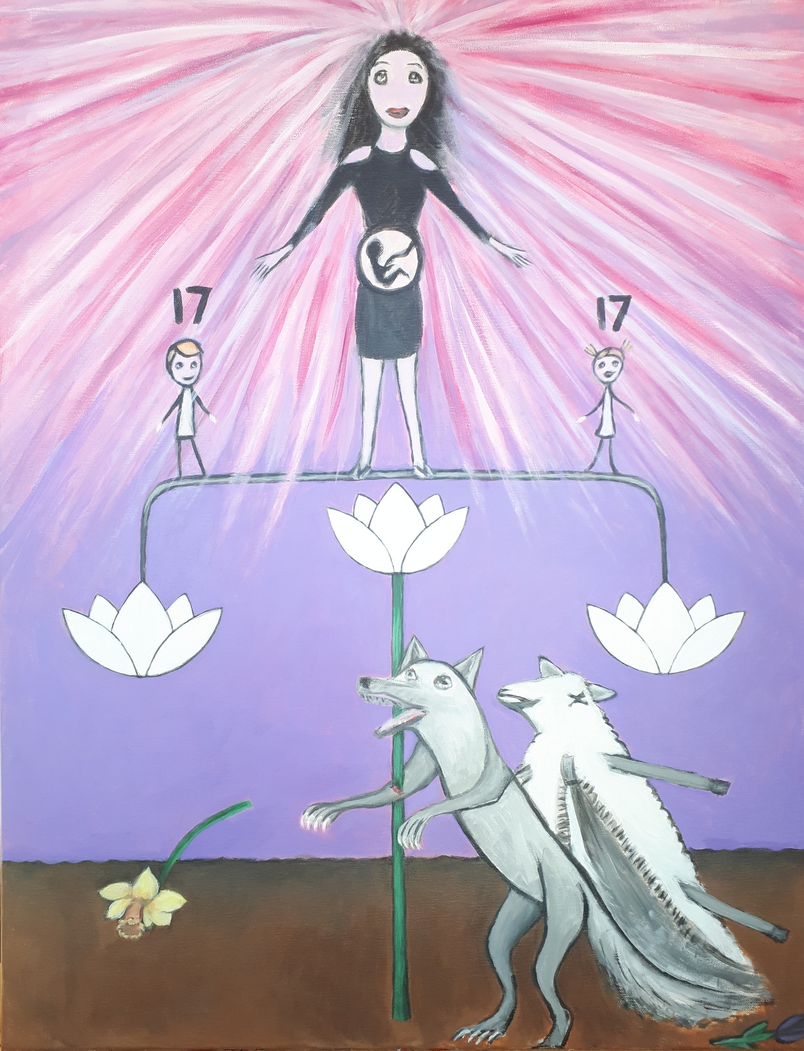 De People/Monsters serie is een analyse van destructief gedrag op macro niveau (Funeral in Beslan) meso niveau ('drinking' the 'Kool-aid') en micro niveau (dit schilderij over de Watts familiemoorden en de gevaren van de narcistische persoonlijkheidsstoornis voor het dagelijks leven). Ik beeldt Shannan Watts en haar dochters CC en Bella op een rudimentaire manier af om de nadruk te leggen op het verhaal over een ogenschijnlijk perfecte vader die op brute manier in 2018 zijn gehele gezin uitmoordde. Deze zaak is vooral actueel vanwege het social media aspect; Shannan creëerde een bewegende catalogus van haar leven door haar producten te verkopen via Facebook live. Deze activiteiten veroorzaakte veel stress bij Chris Watts, een nog grotere noodzaak zijn masker voortdurend op te poetsen en te voorkomen dat het afviel. De titel van het doek verwijst naar Shannan's aankondiging van haar zwangerschap door een shirt te dragen met de tekst 'oeps, we did it again', een parafrasering van het Britney Spearsnummer, met ook de volgende tekst: I'm not that innocent'. Mijn grote interesse in deze zaak heeft te maken met mijn interesse in de narcistische persoonlijkheidsstoornis. Daarnaast: Shannan's favoriete kleur was paars, zoals de mijne, en de meisje waren beide geboren op de 17e, mijn favoriete nummer. De weegschaal van lotusbloem verwijst naar de macht en wijsheid die we kunnen bereiken door een groter begrip te verkrijgen van de menselijke natuur. Wanneer we voor het eerst over narcisme horen, moeten we nog checken of iemand een rits op de buik heeft, maar naarmate we leren zullen we de gedragingen gaan herkennen en onszelf kunnen beschermen tegen de wolf eronder. Lotusbloemen groeien op modder zoals Shannan, Bella CC en Niko groeiden op het kwaad.
