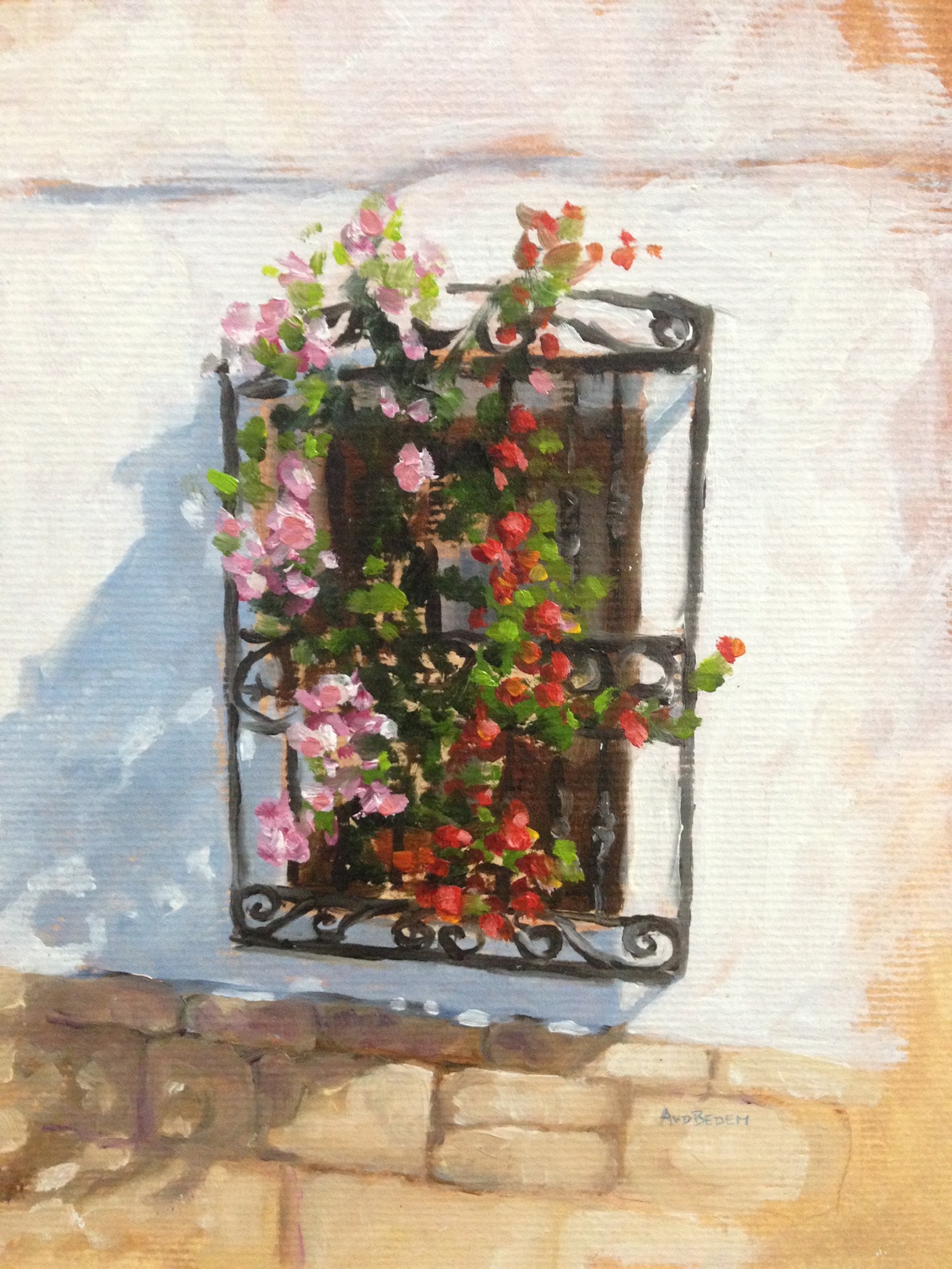 Impressionistisch Schilderijtje Spaans Balkon Met Rode Bloemen