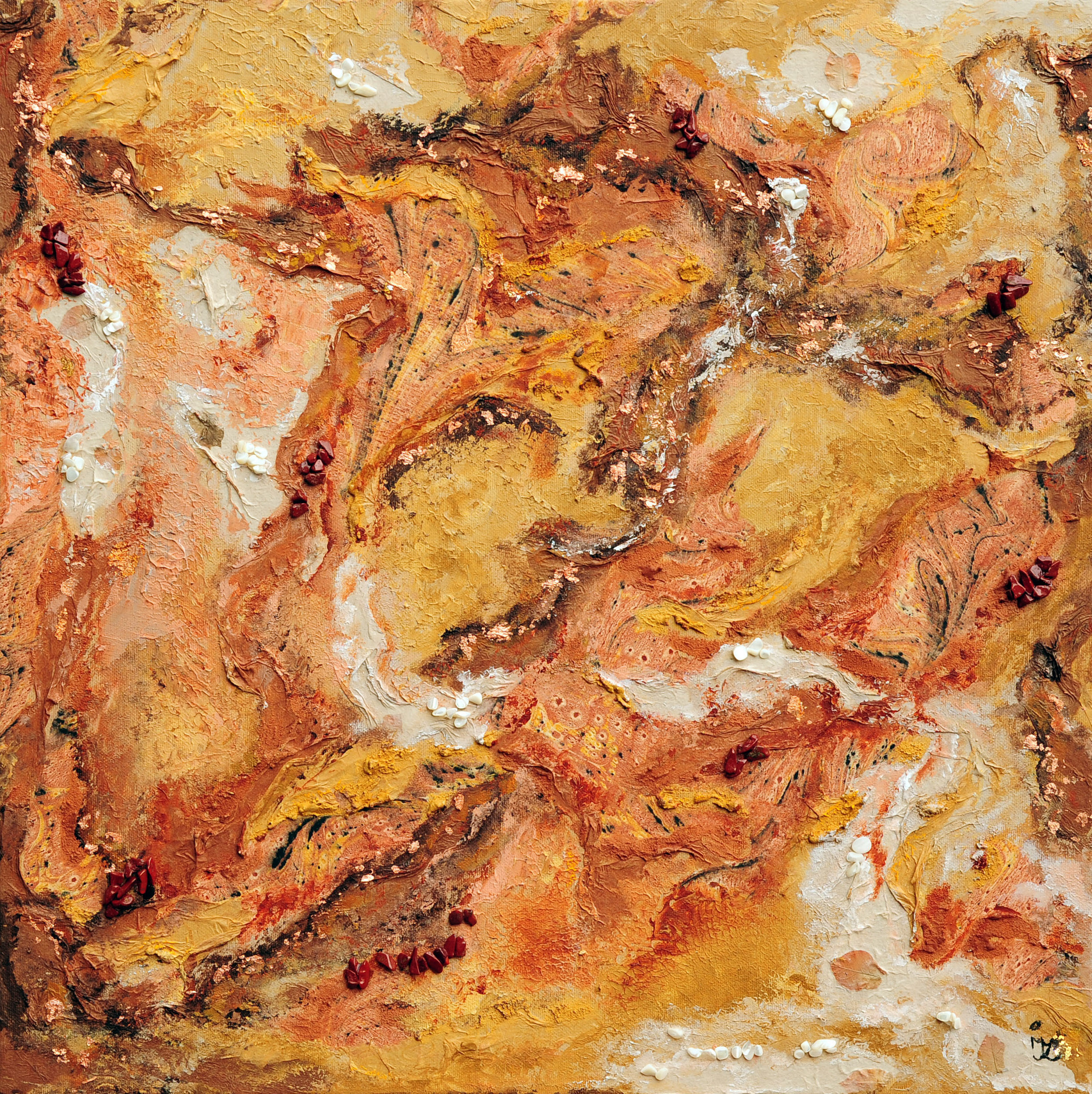 Acryl op doek, gemengde techniek met rode jaspis, parelmoer en turks Ebru papier.