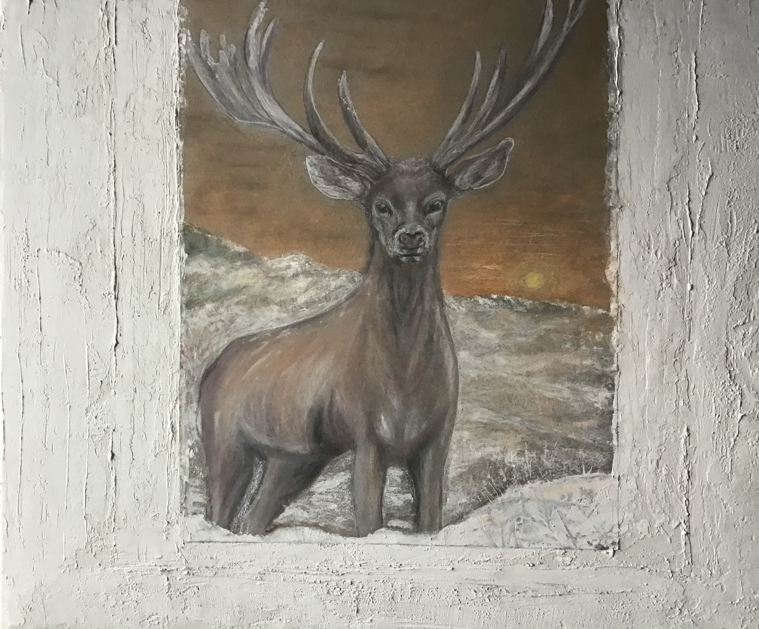 Hert in de besneeuwde Meeuweduinen in Westenschouwen. Pastel en kalk