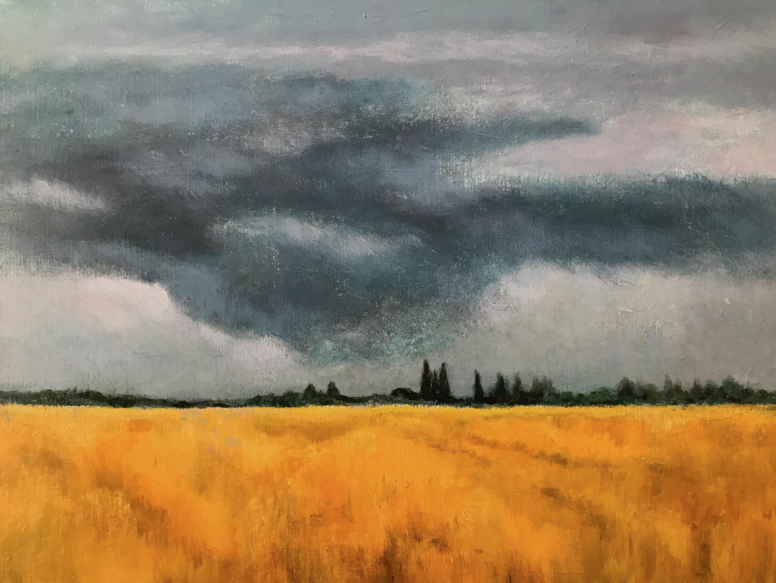 Donkere wolken boven geel graanland.