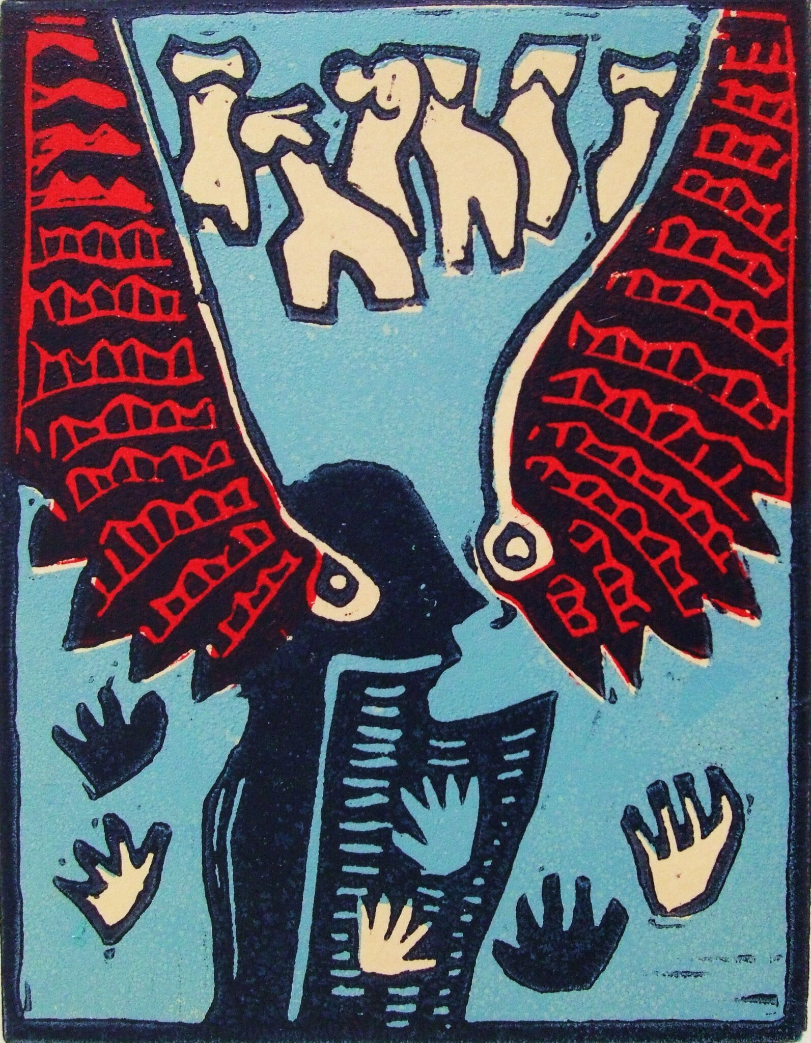 Prentje cadeau (kleine meer-kleuren linosnede, met passe-partout in aluminium of eikenhouten lijstje, formaat A4) € 125,-- inclusief verzendkosten Voorbeelden te zien bij de informatie pagina’s
