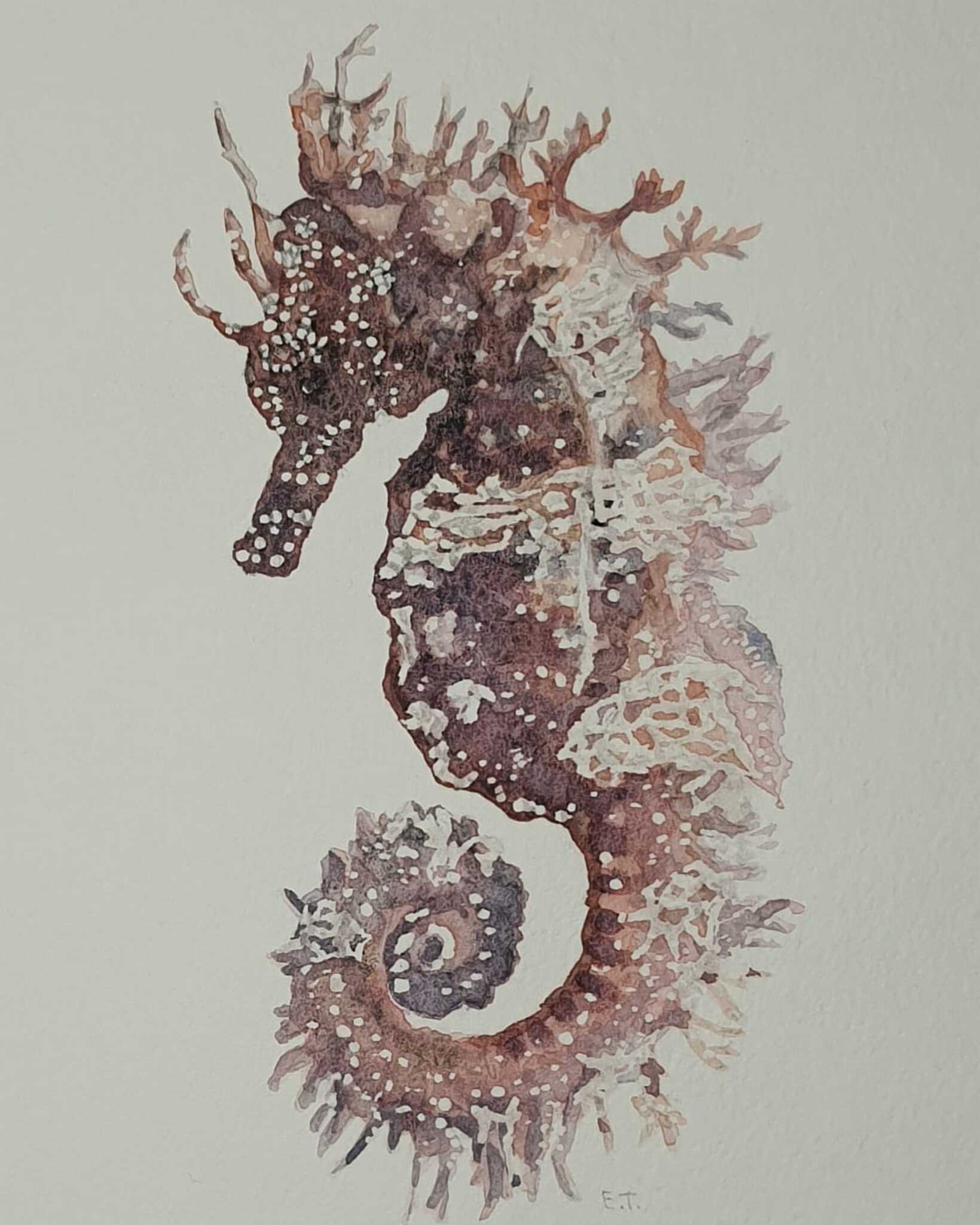 Zeepaardje. Aquarel. Geschilderd met maar 3 kleuren.