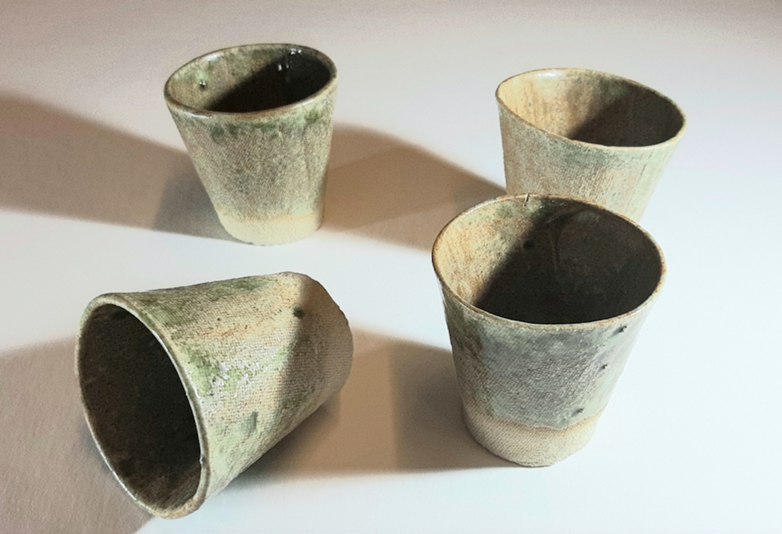 set van 4 kleine superlichte bekertjes, steengoed en asglazuur