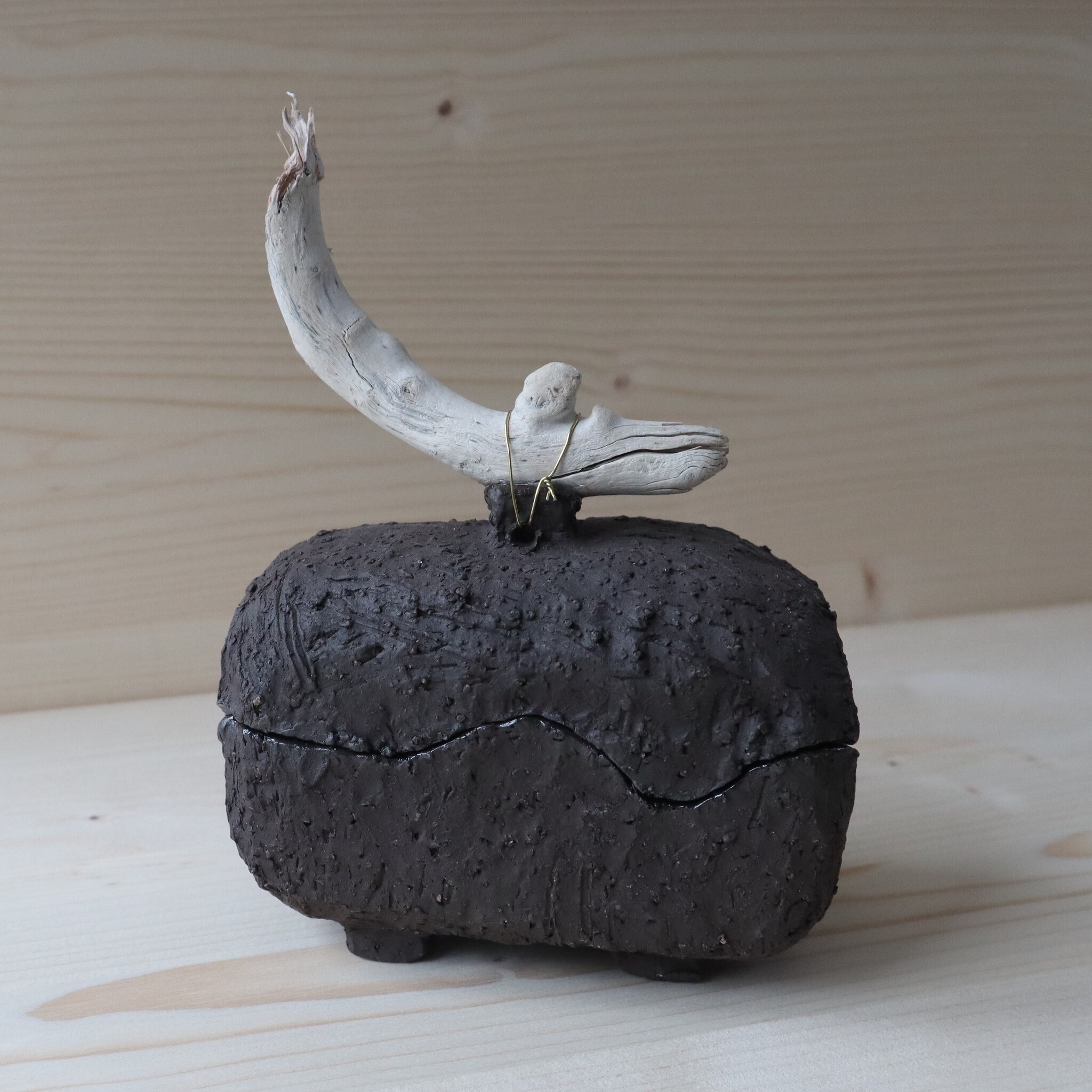 Deze doos is gemaakt van zwarte grof gechamoteerde klei, glans glazuur aan de binnenkant met takje als knop. Gewicht 518 gram.