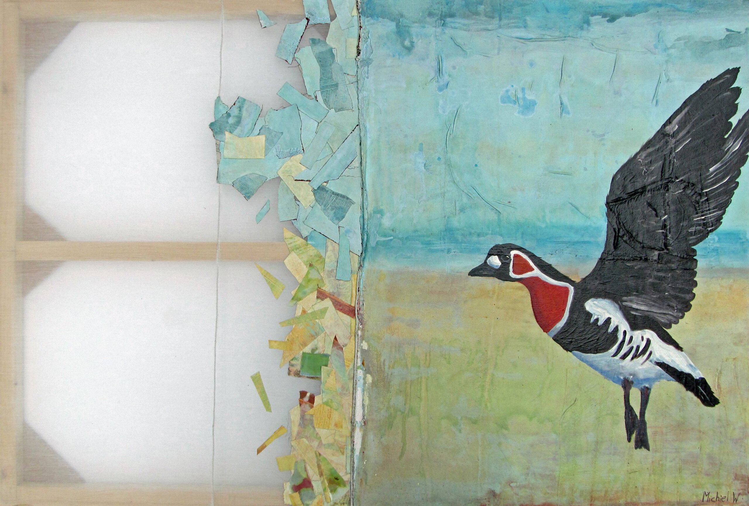 Roodhalsgans in overgang tussen werelden. Acryl en olieverf of doek en vitrage.