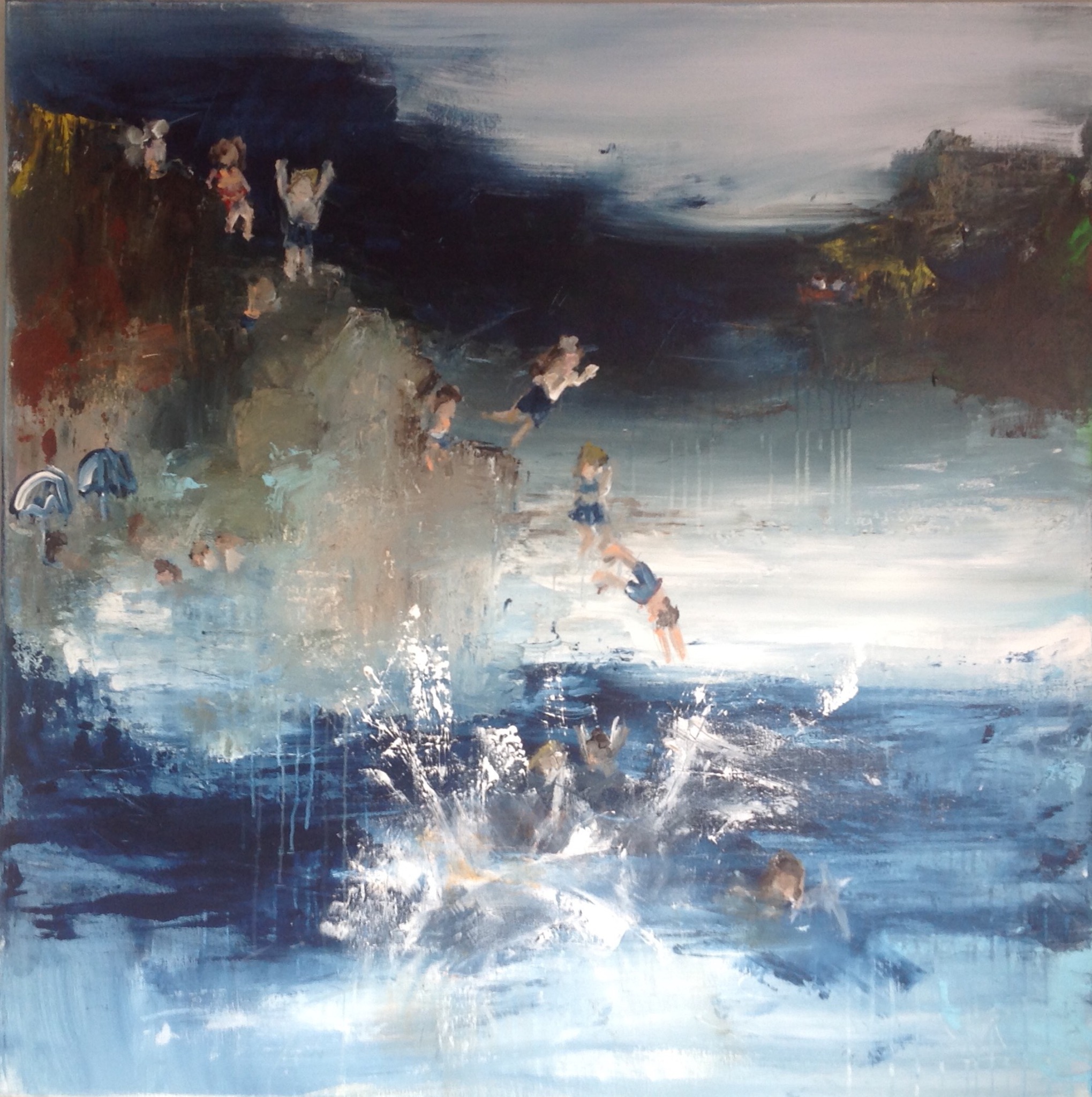 I see an abstract painting of people who are enjoying their free time and each other. Memories . the nature is what you're looking, rocks, water, the sun nd mountains at the background. the price is excl shipment