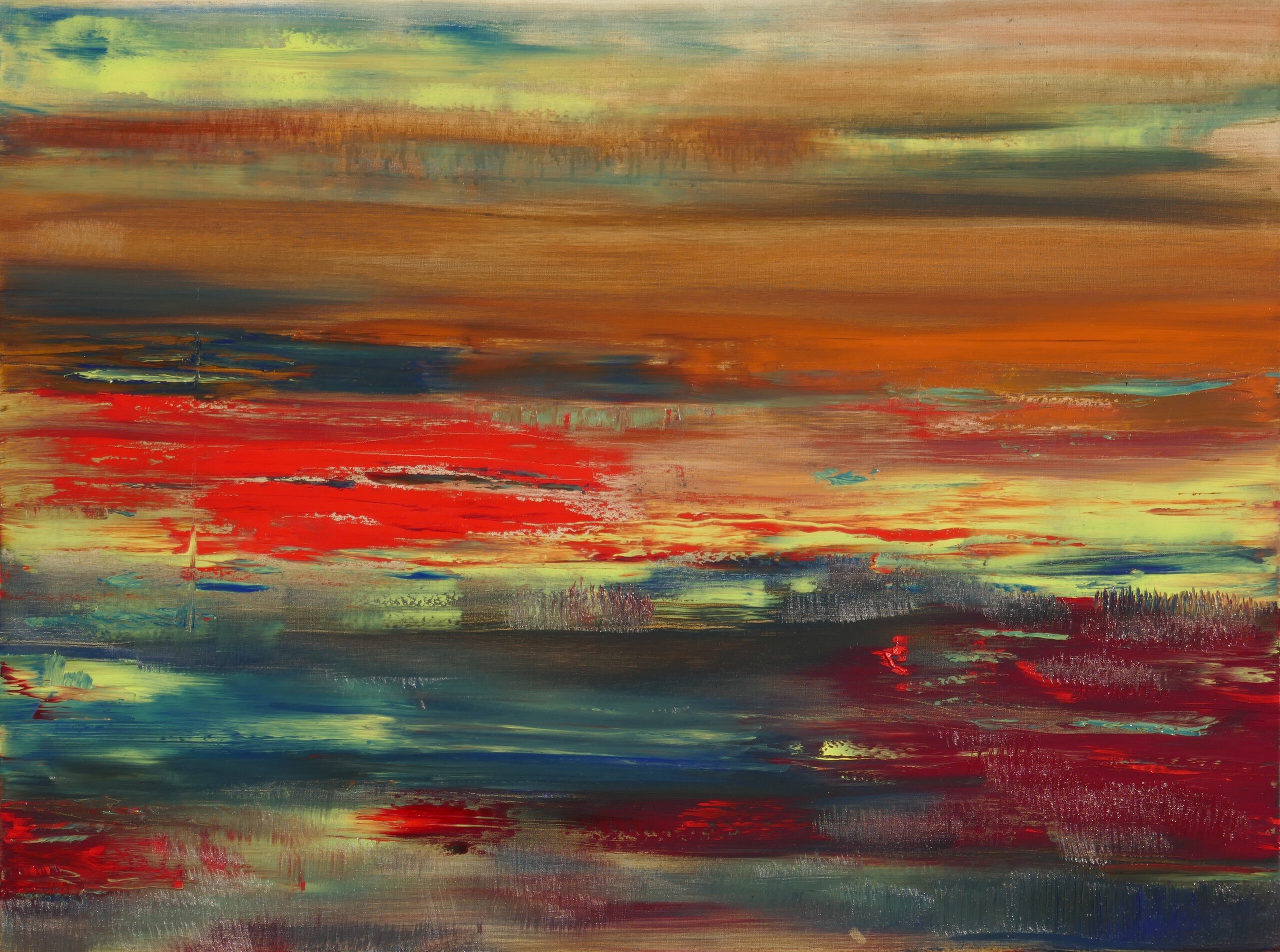 Geabstraheerd landschap met klaprozen.Het gevoel laten spreken. De zijkanten van het doek zijn doorgeschilderd.