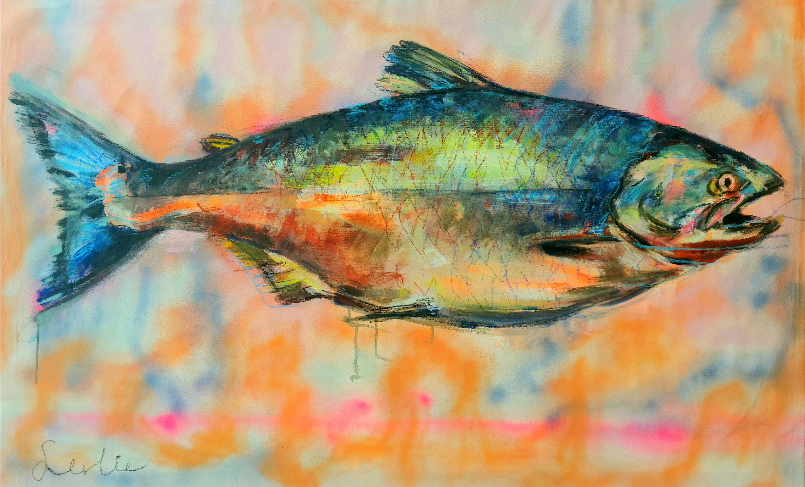 Grote wilde zalm, kleurrijike vis geschilderd op een groot doek Let op! dit schilderij dient bij mij afgehaald te worden.
