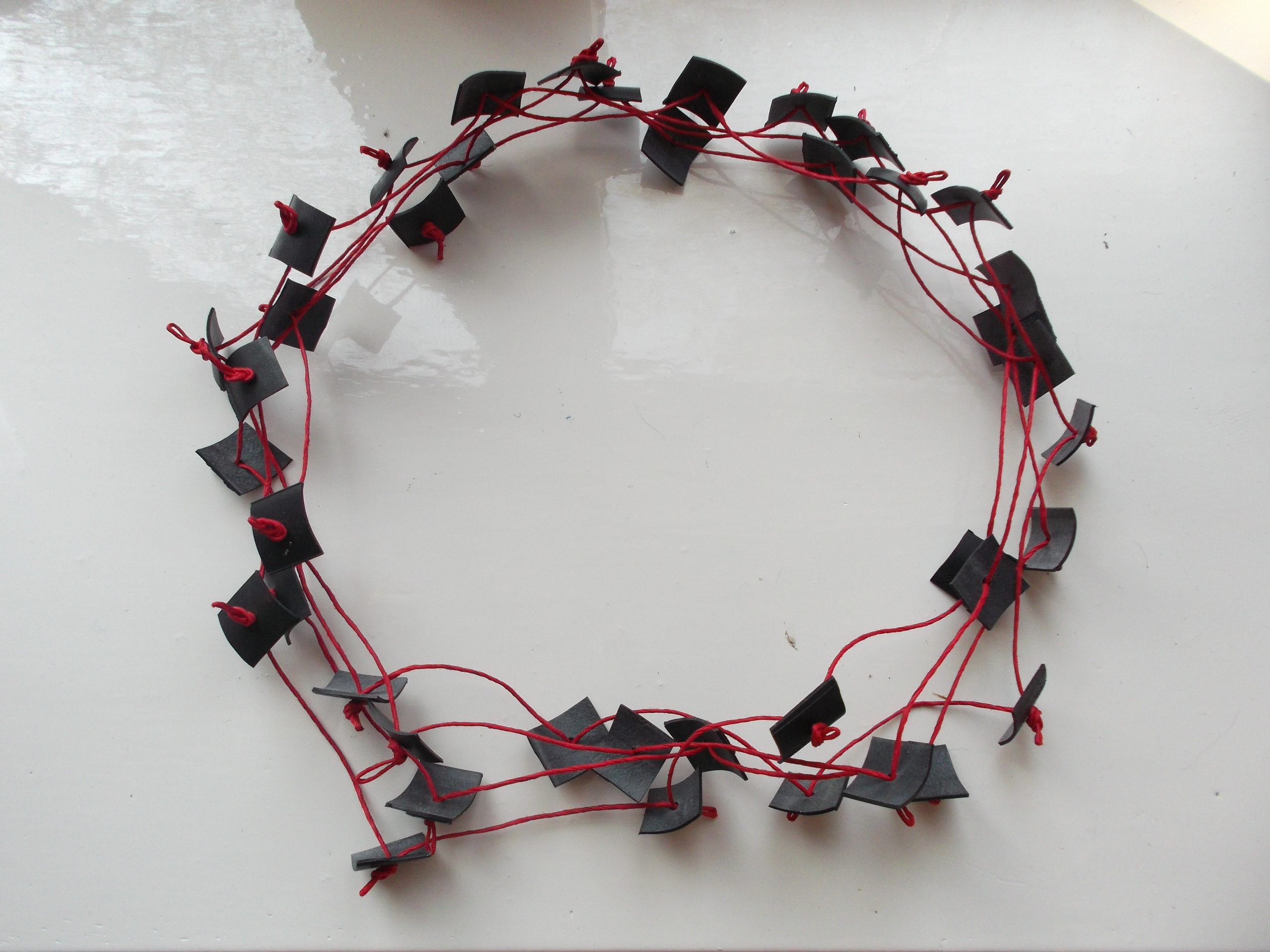 Halssieraad gemaakt van papiertouw en leer. Uniek en duurzaam gemaakt, want het leer is afval van een leeratelier.