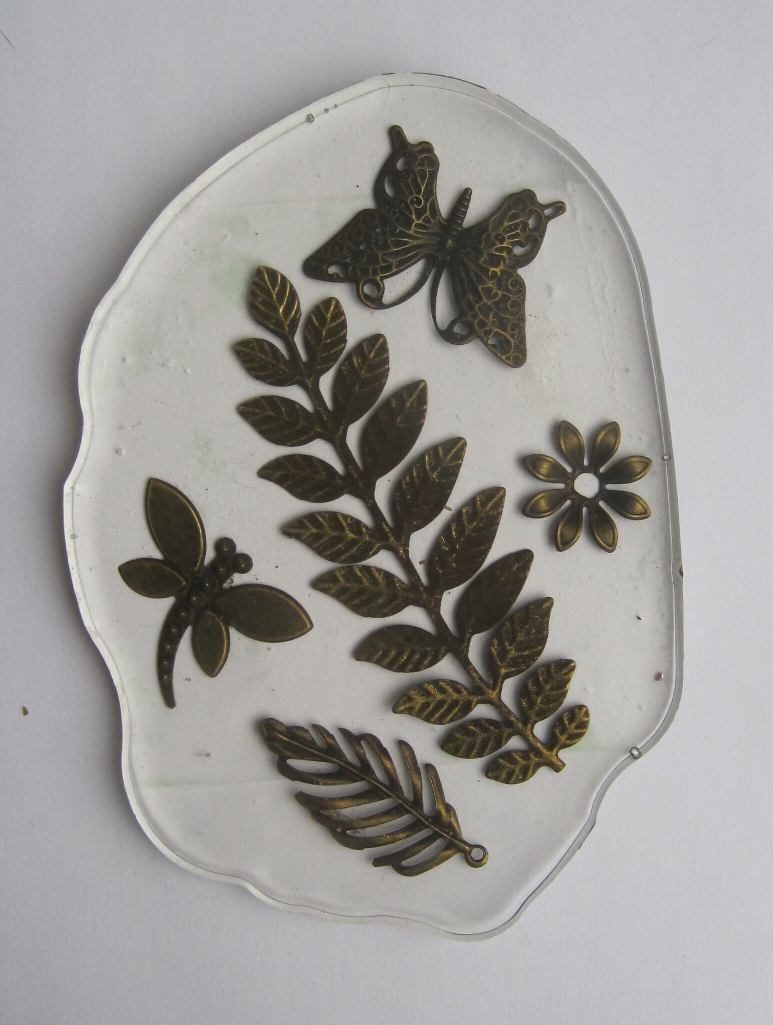 Onderzetter bronzen vlinders en bloemen. Doorzichtig.