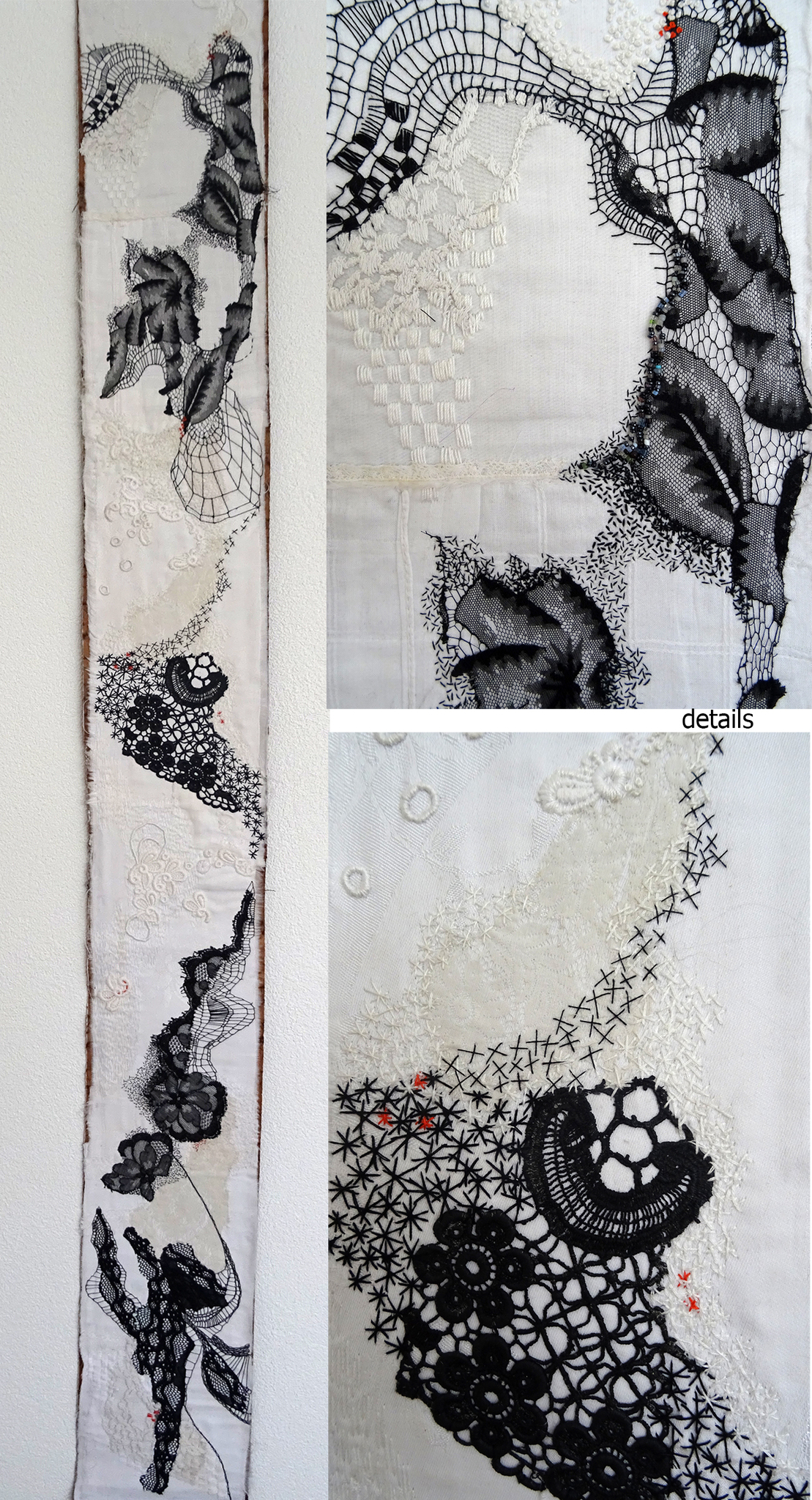 Werk met handborduurwerk, stukken kant en kraaltjes.