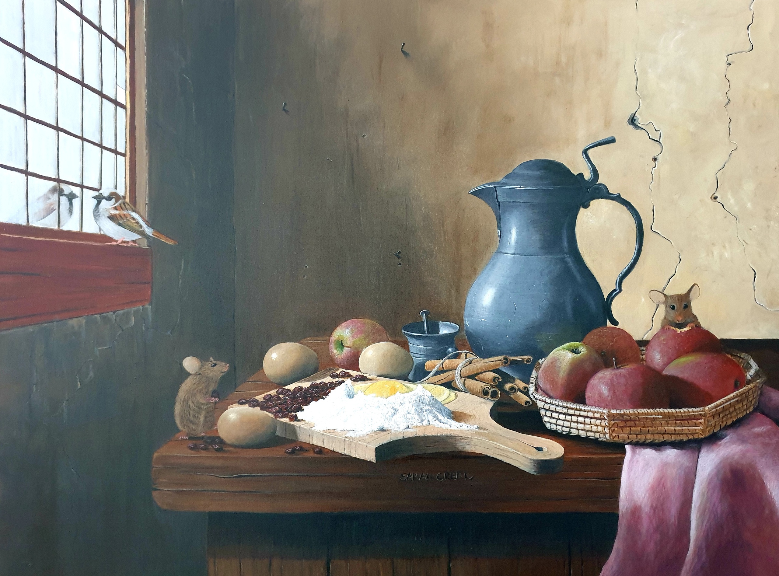 Sarah Creek schildert met acryl op canvas of linnen. Onderwerpen zijn portretten en stillevens. Sarah geeft les aan 55 talentvolle cursisten in een atelier aan huis.