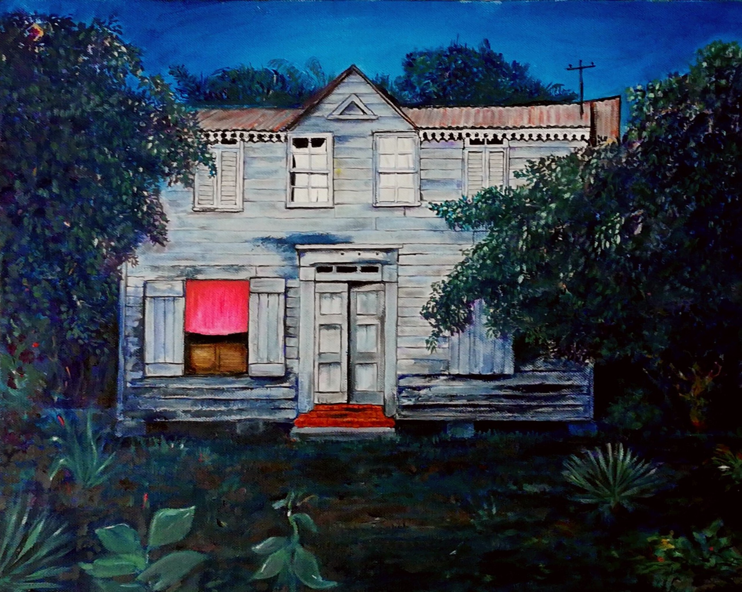 Een oud houten huis in Suriname bij nacht.