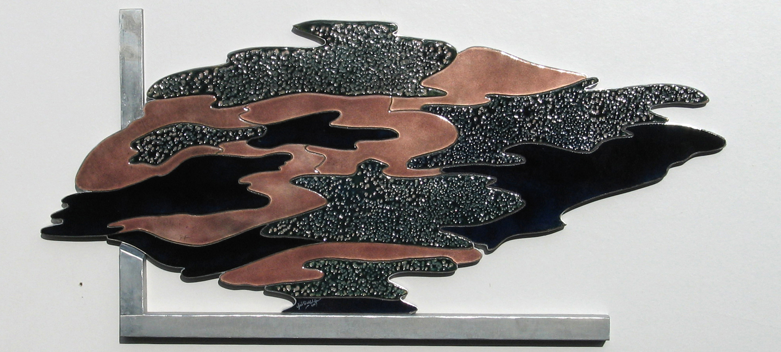 Ik ben emailleur en maak wandpanelen en reliëfs. Vaak verwerk ik er ook gefused- of brokken glas in. De zijkanten en holtes van de reliëfs werk ik af met verouderd zink.