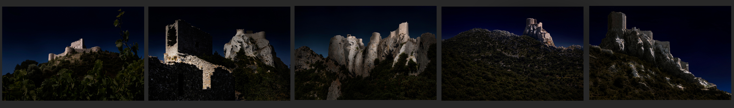 Een serie over ruines van katharenkastelen. De architectuur en de natuur vloeien in elkaar over. Licht en donker bepalen de mystieke sfeer.