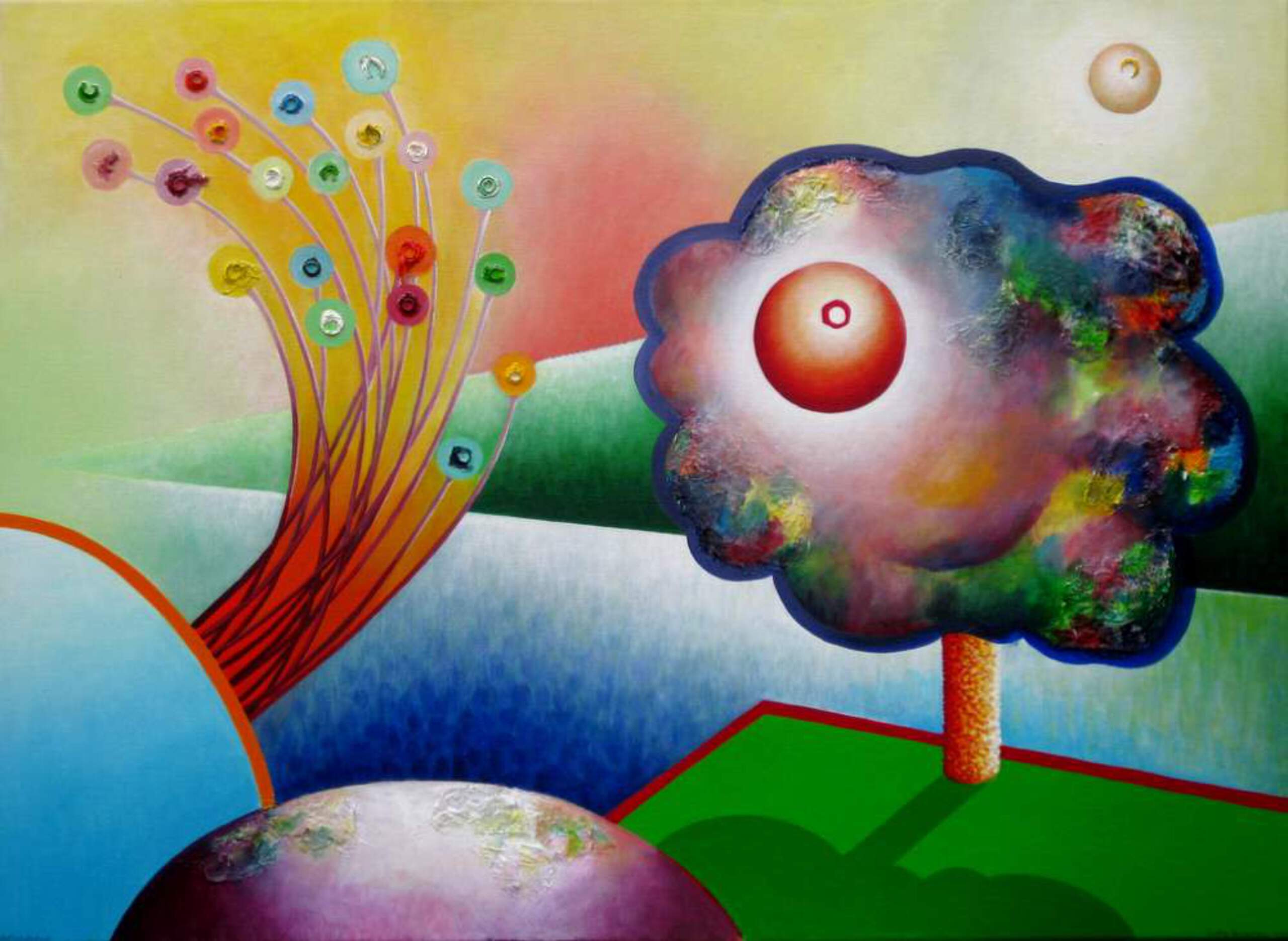 Mijn werk is zeer kleurrijk. Ik balanceer graag op de grens tussen figuratief en abstract, waarbij ik mijn eigen droomwereld creeer. Mijn inspiratie haal ik uit de natuur en het materiaal.