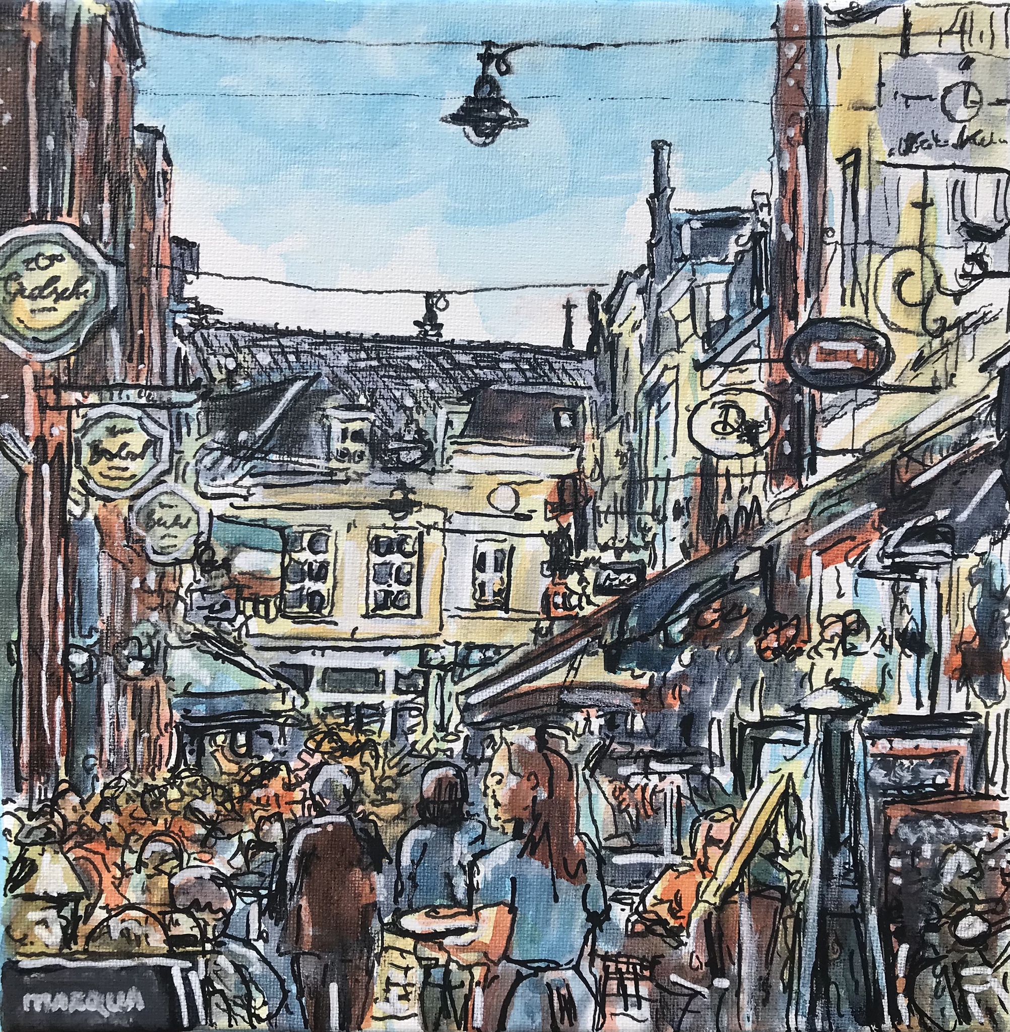 Korte Putstraat met terrassen in inkt op doek 20x20 cm.