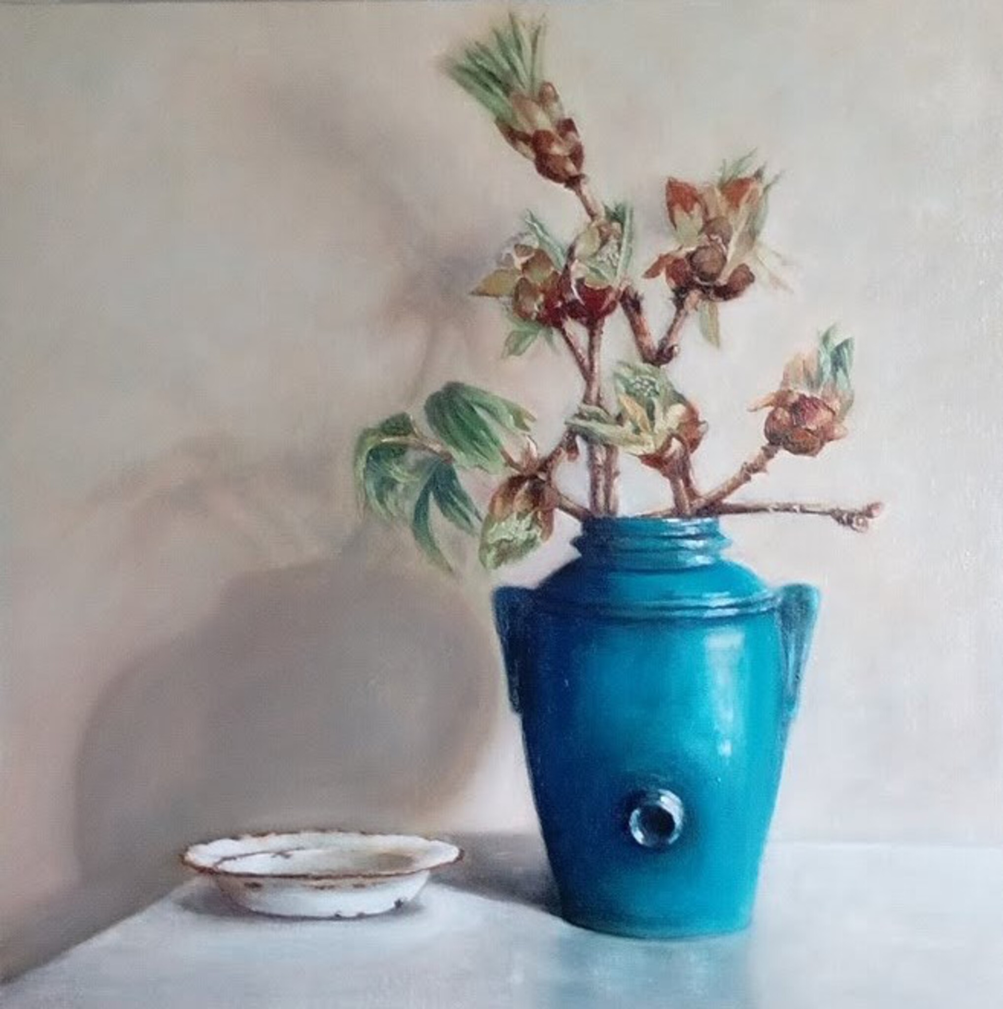 Figuratief Blauw Schaal Realistisch Olieverf Doek Oud Takken Kruik Schaduw Emaille Klassiek Kastanje