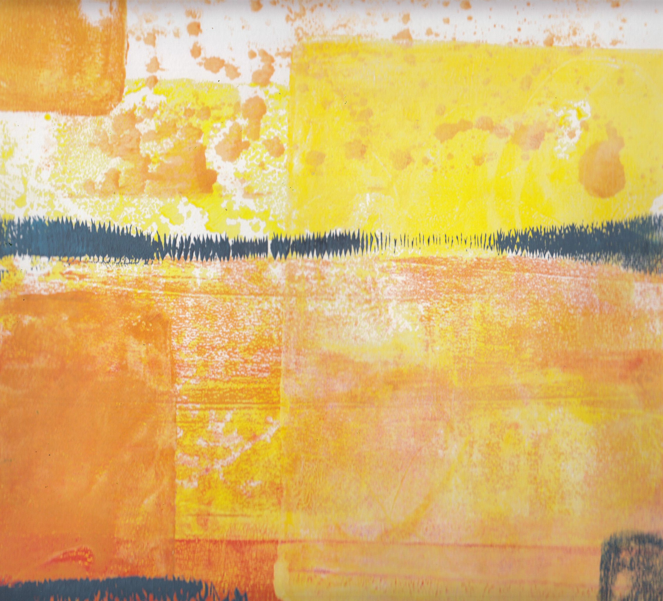 Monoprint van acrylverf op papier. Gemaakt in meerdere lagen. Beschikbaar in passepartout van 30 bij 40 cm. Deel van een serie monoprints met landschap-effect. Deze print roept voor mij het gevoel op van een weids strand met duinen in de verte.
