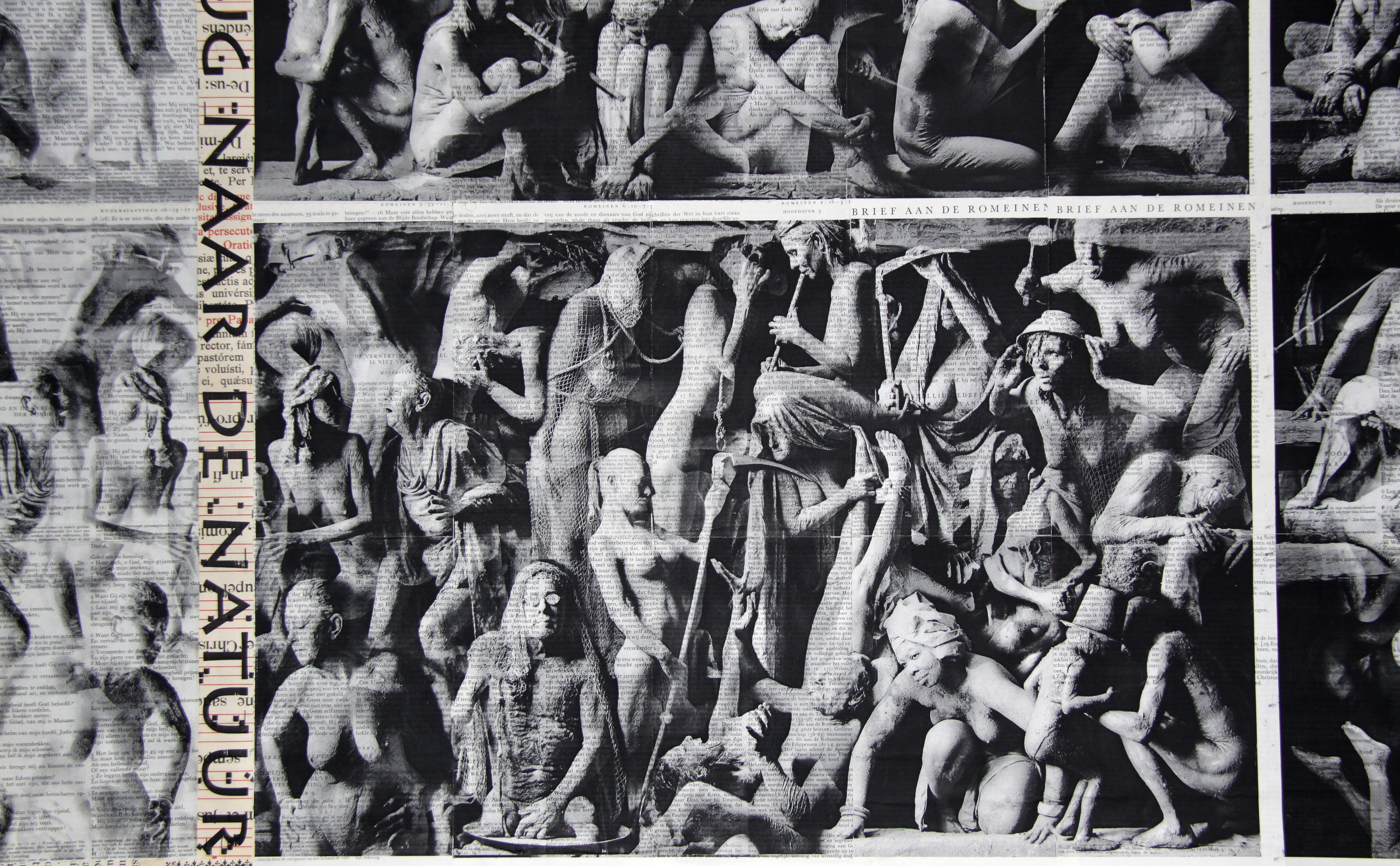 Detail van het vierluik 'Tussen Hemel en Aarde' , papier, geprint op de bladen van een oude kleine bijbel.