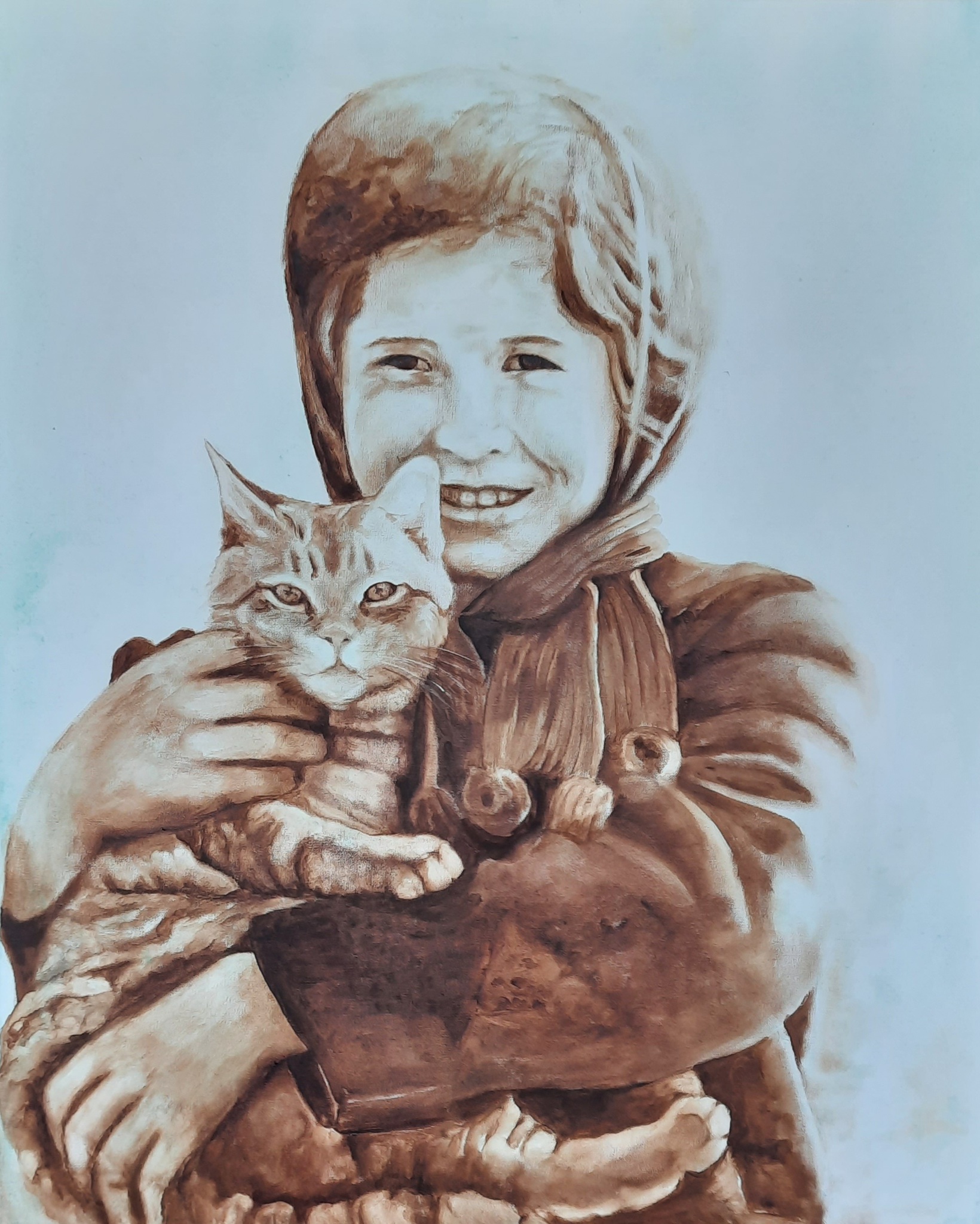 Portret van Marijke als meisje...gemaakt in droge verf techniek met olieverf..