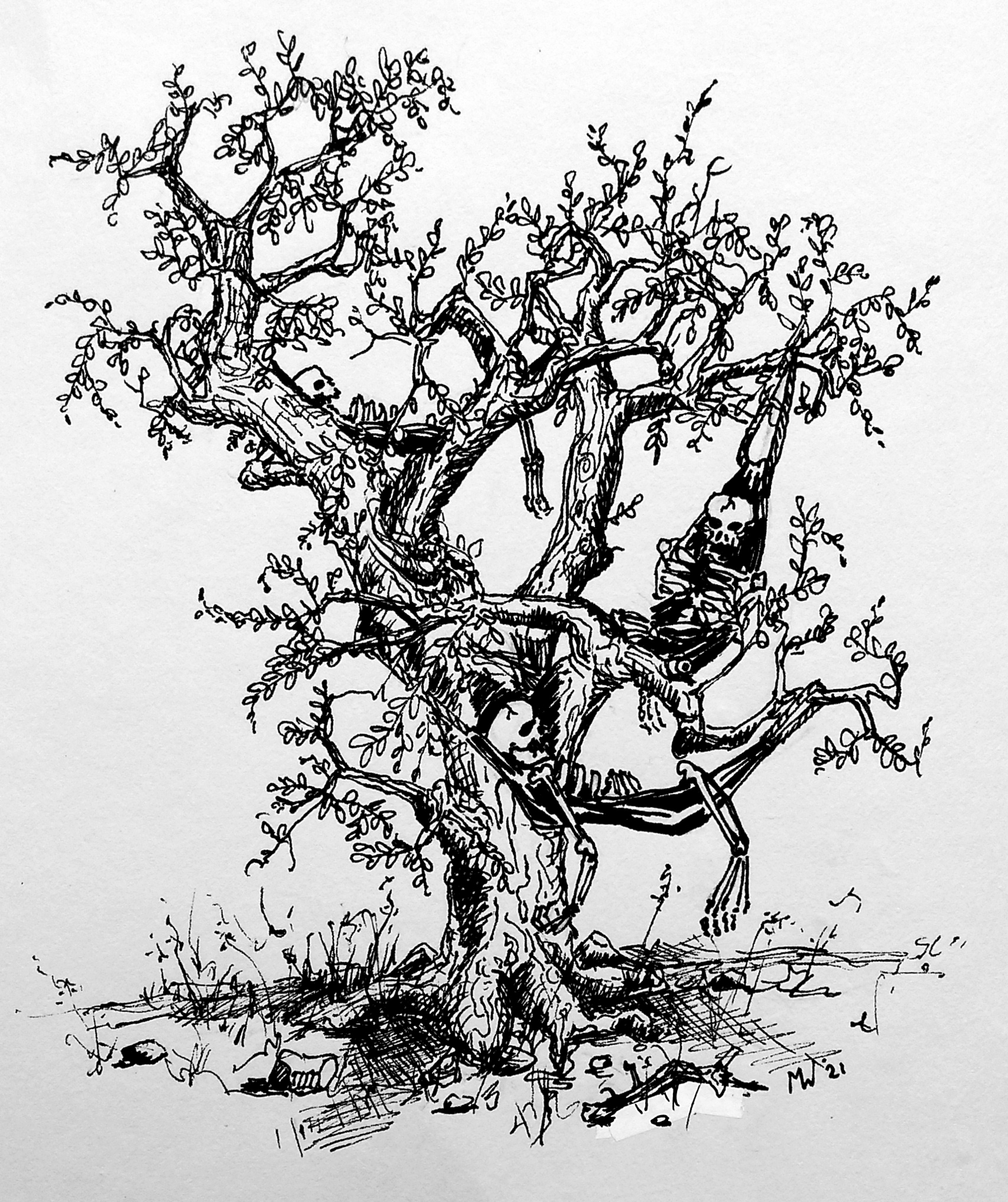 Luierende skeletten in een boom.