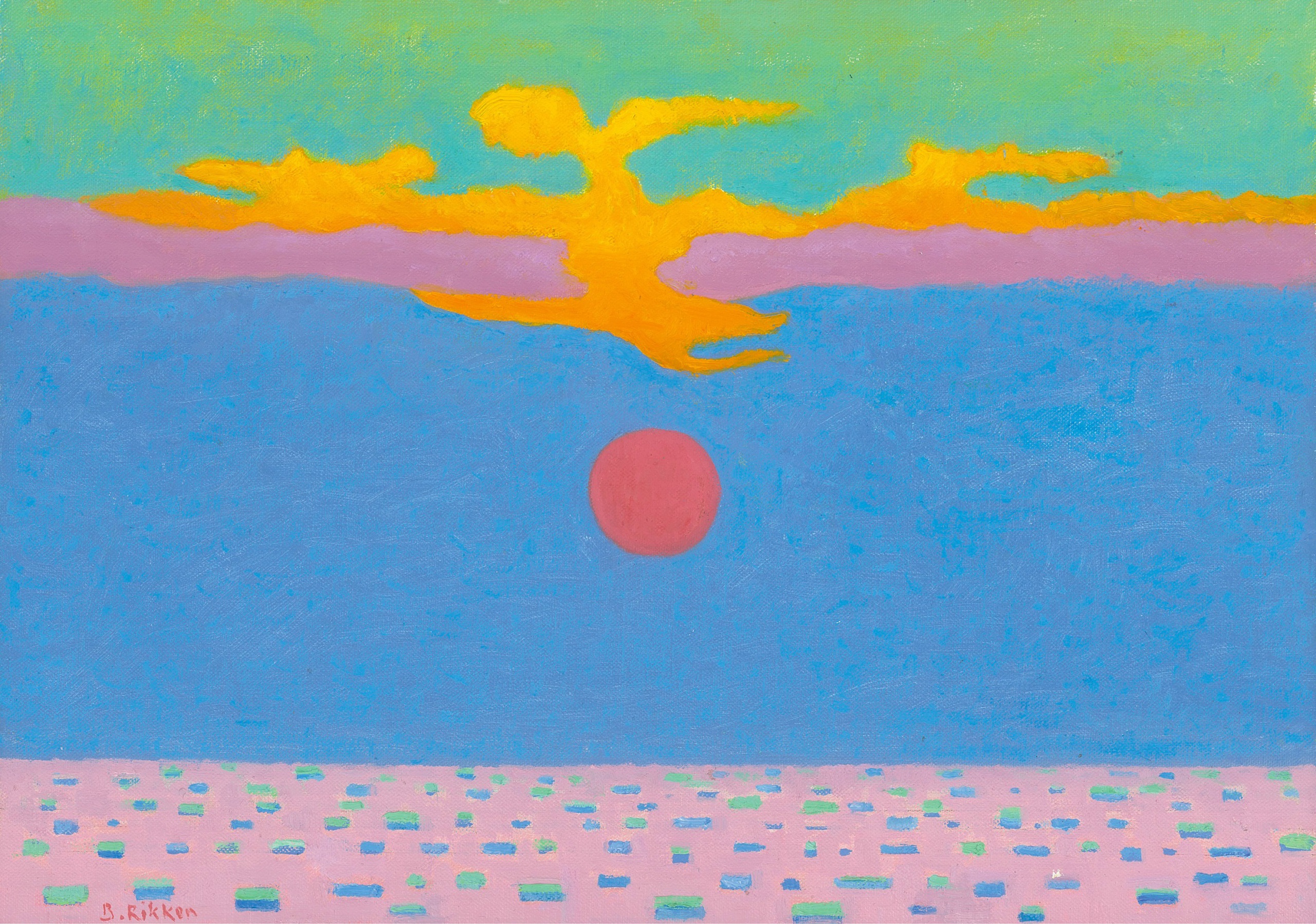 Een doemend rode zon hangt in een zacht blauw boven zee ; de wolkenranden kleuren fel geel en oranje. Het stille water is een twinkelende spiegel.