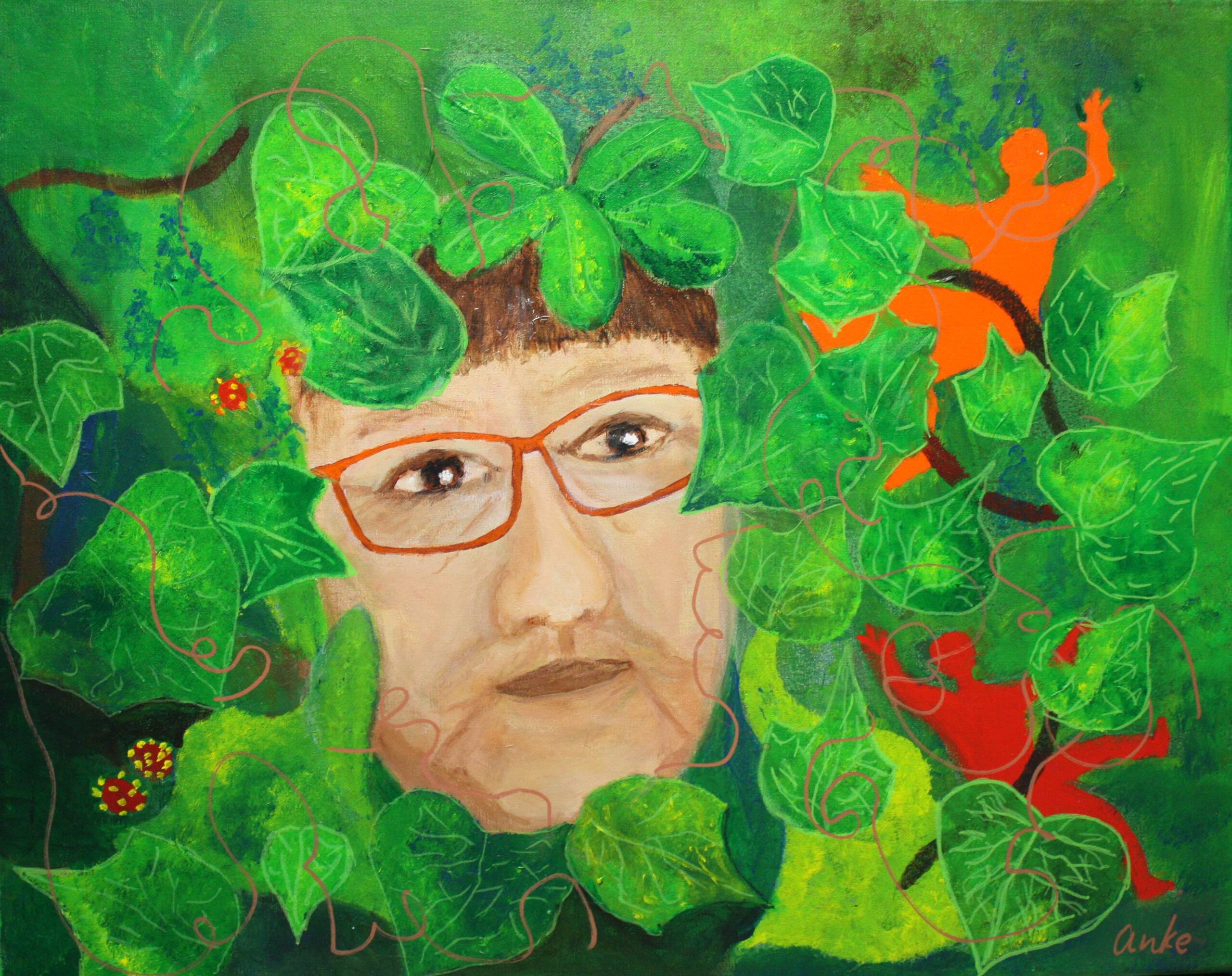 zelfportret omringd door natuur. De natuur overheerst de mens.