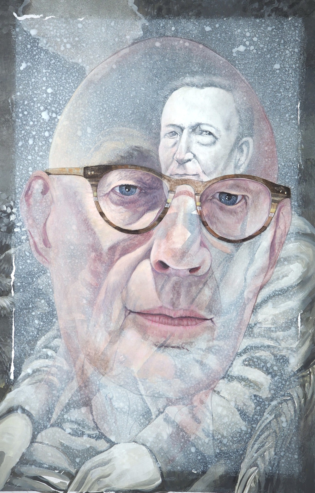 Mijn opa's en oma's heb ik nooit gekend. mijn ouders waren beiden al jong wees. Met behulp van oude foto's van mijn vaders vader heb ik contact willen leggen met deze opa. Door het schilderen van portretten kom ik heel dicht bij de afgebeelde persoon. Mijn eigen kop is daar half transparant aan toegevoegd om de verbinding te suggereren.