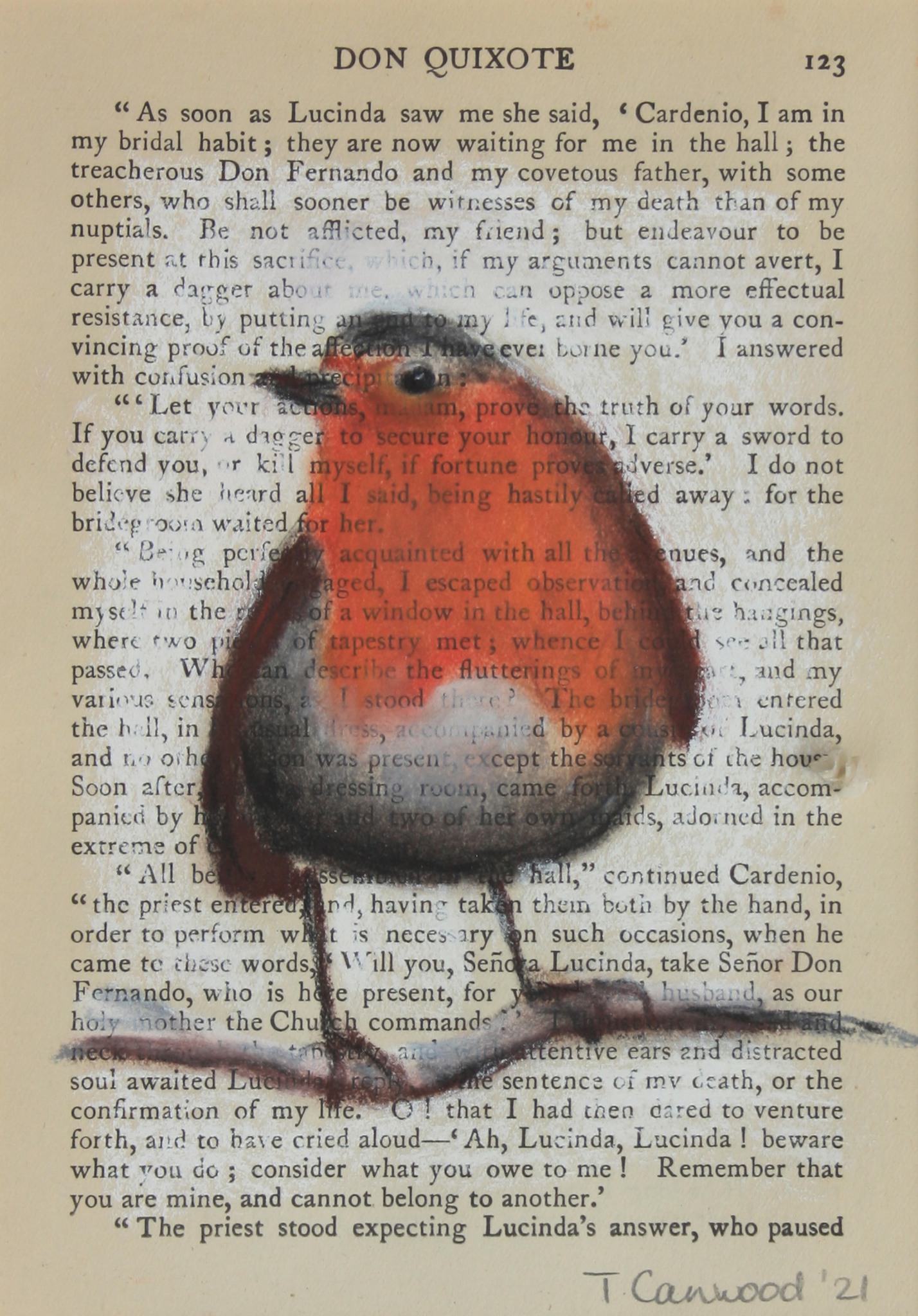 krijt op een bladzijde uit een engelse vertaling van Don Quichotte (1929) Deze is verkocht, maar als je iets vergelijkbaars wil stuur me dan een bericht.