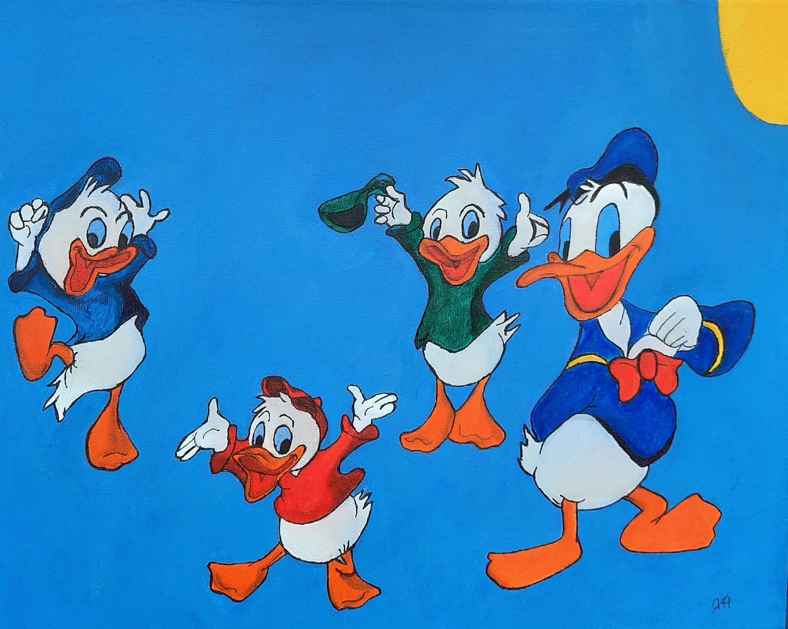 Donald Duck, Kwik, Kwek, Kwak is een vrolijk schilderij waar kinderen blij van worden.