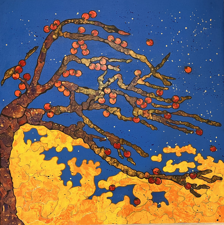 Ik maak collages van monoprints met acryl, gouache en inkt op rijstpapier.