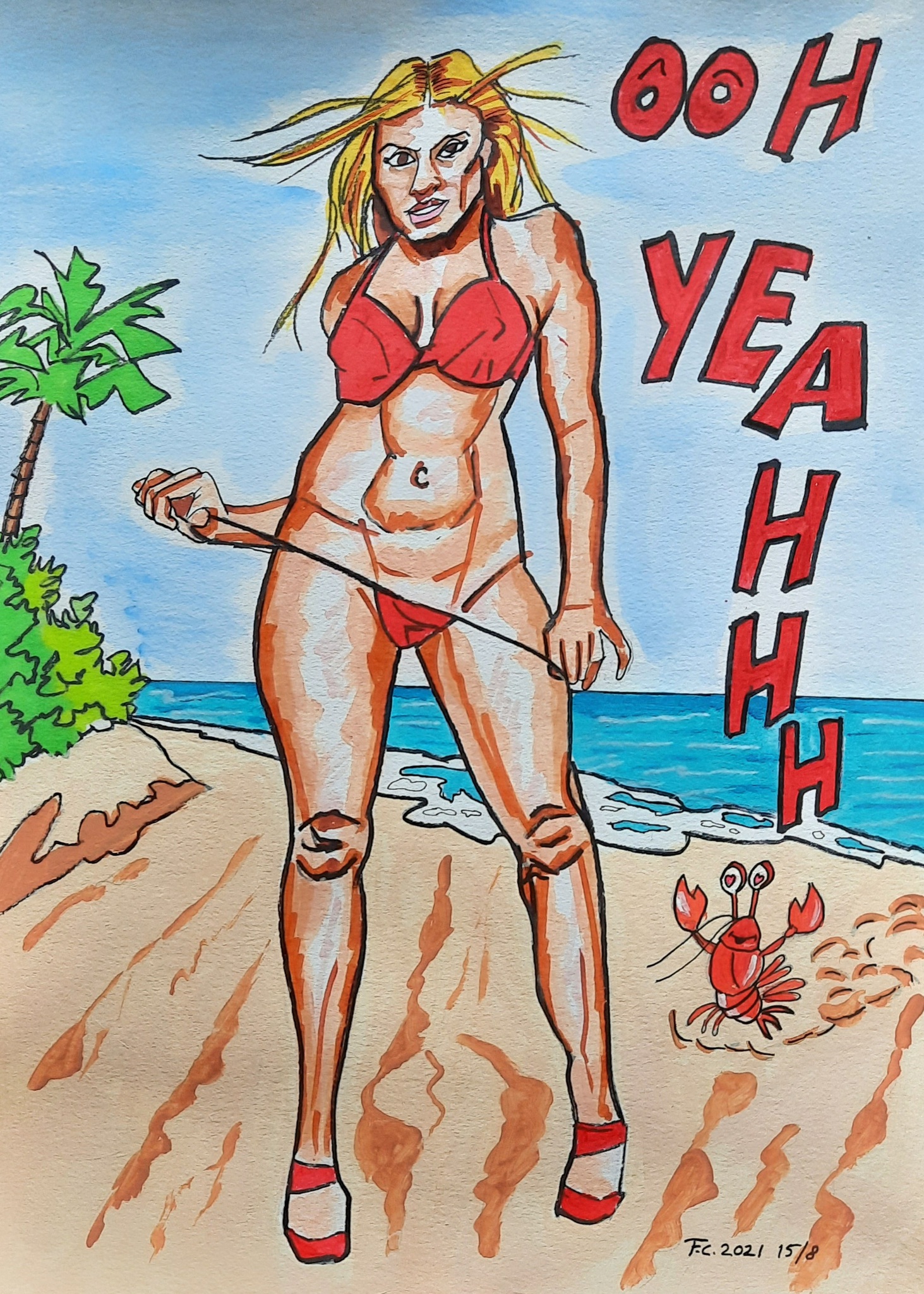 Zee Zon Strand Rood Vrouw Mixed Media Tropisch Bikini Palmboom Popart Sexy Erotiek