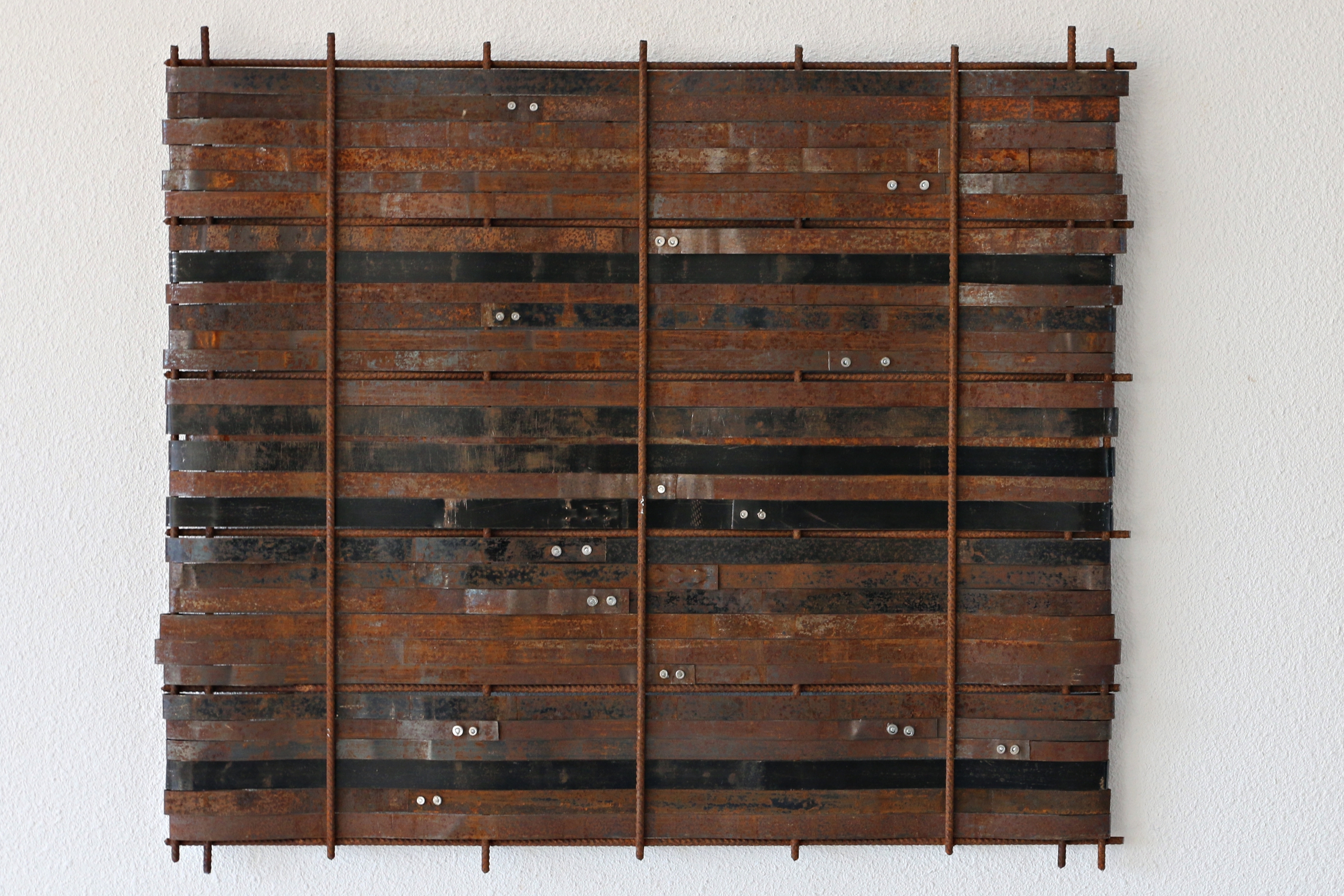 Wandobject uit gevlochten geroest metalen strips.