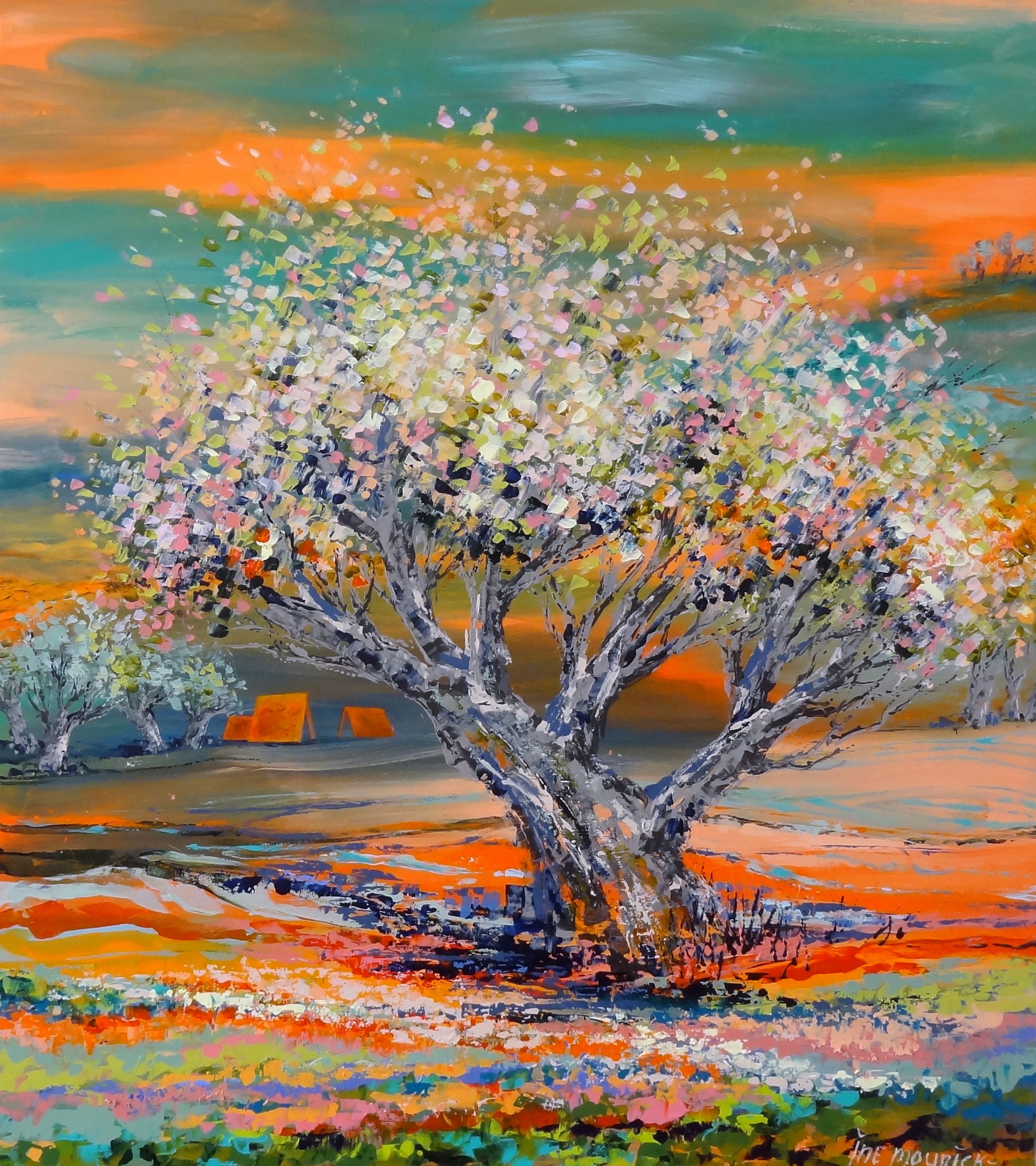 Expressief zomeravond landschap schilderij. Mijn inspiratie: de kleuren die de lucht kan hebben op een zomeravond. De avond lucht veranderd langzaam van kleur met de meest bijzondere kleuren van oranje, rood, roze tot soms zelfs groen. Een oude appelboom is omgeven door kleurrijke heuvels, die bedekt zijn met een kleurrijk bloementappijt. Enkele boerderijen met oranje daken zij verderop in het landschap gelegen.