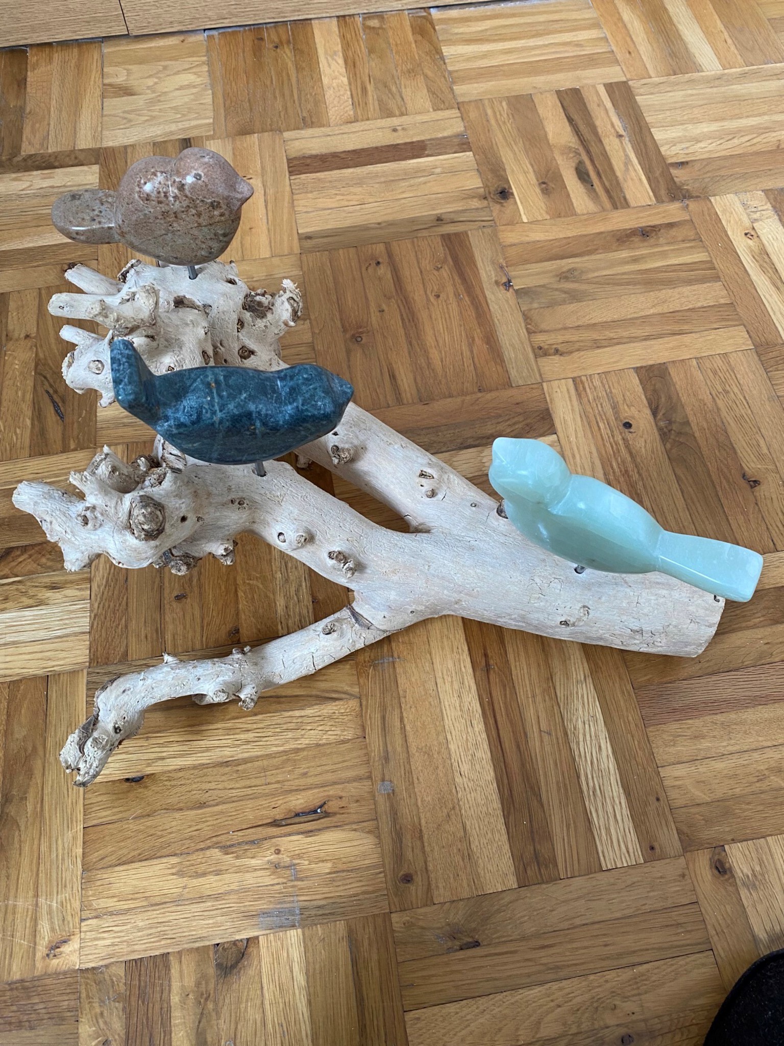 vogels op hout uit braziliaans en indiaas speksteen.