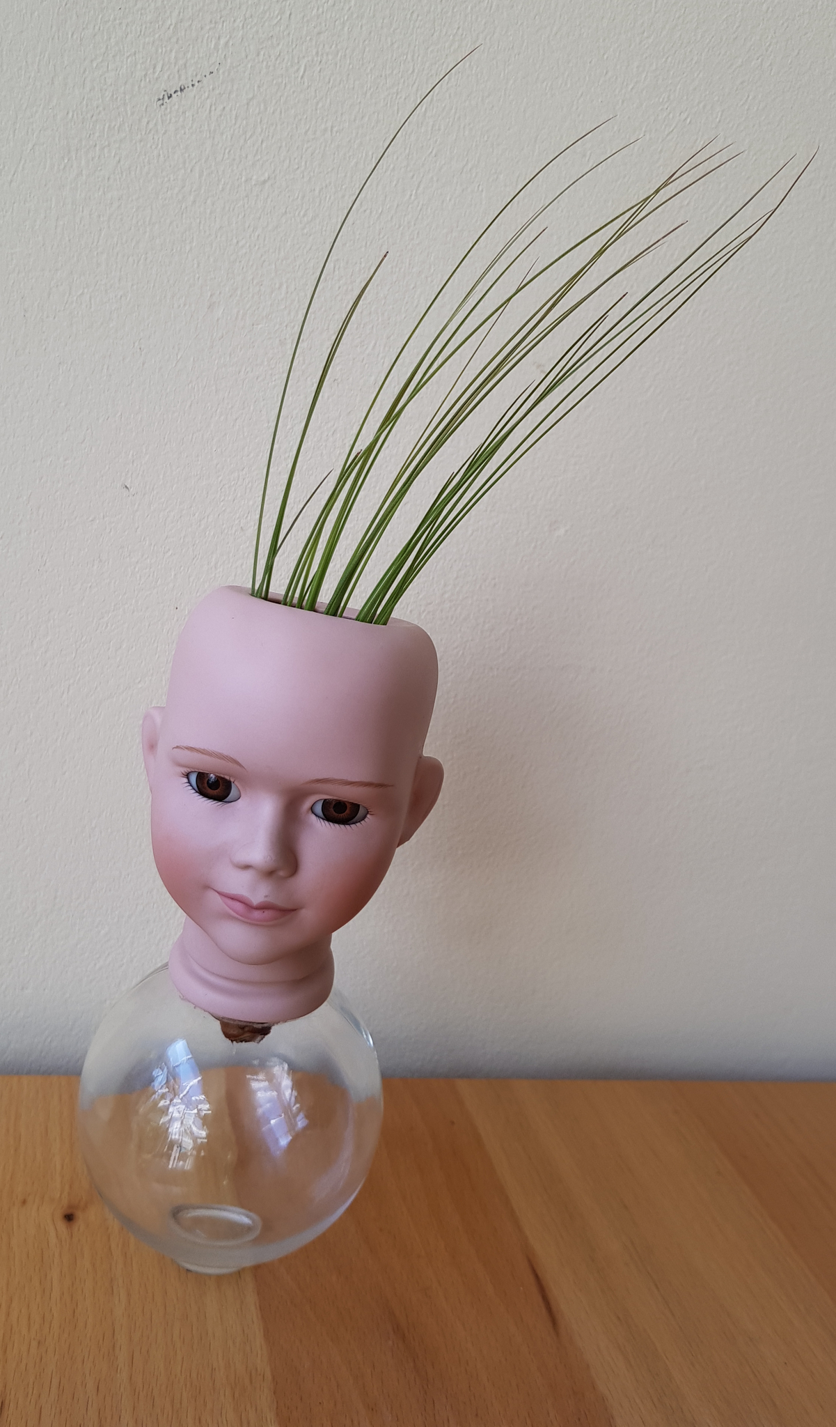 Geen haar, maar een levend luchtplantje. Naarmate het groeit, kan de wortel verder in het glazen bolletje geduwd worden.