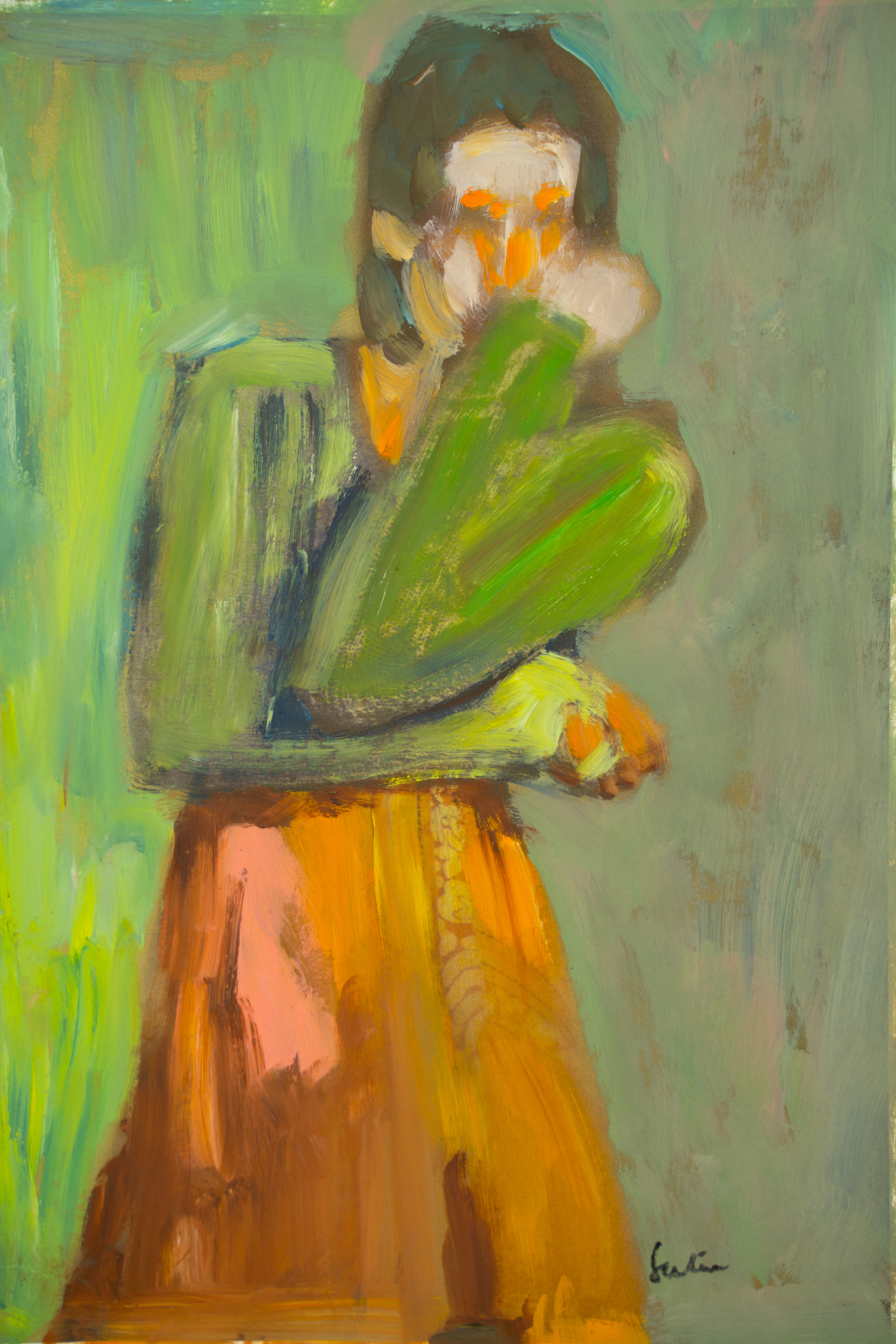 Schilderij Mensen Oranje Emotie Acryl Groen Vrouw Model Kleur Houding Spontaan Bedroefd Serlie