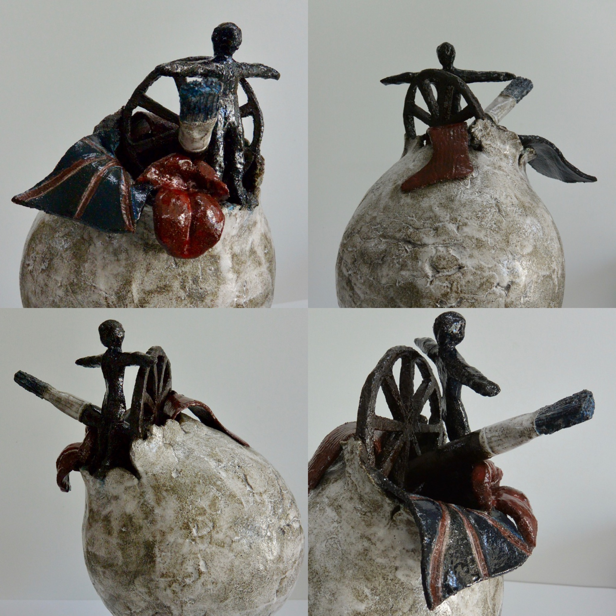 bal die na spanning openbarst waarna een klein figuurtje kan ontsnappen en de vrijheid tegemoet kan gaan, omringt door symbolen