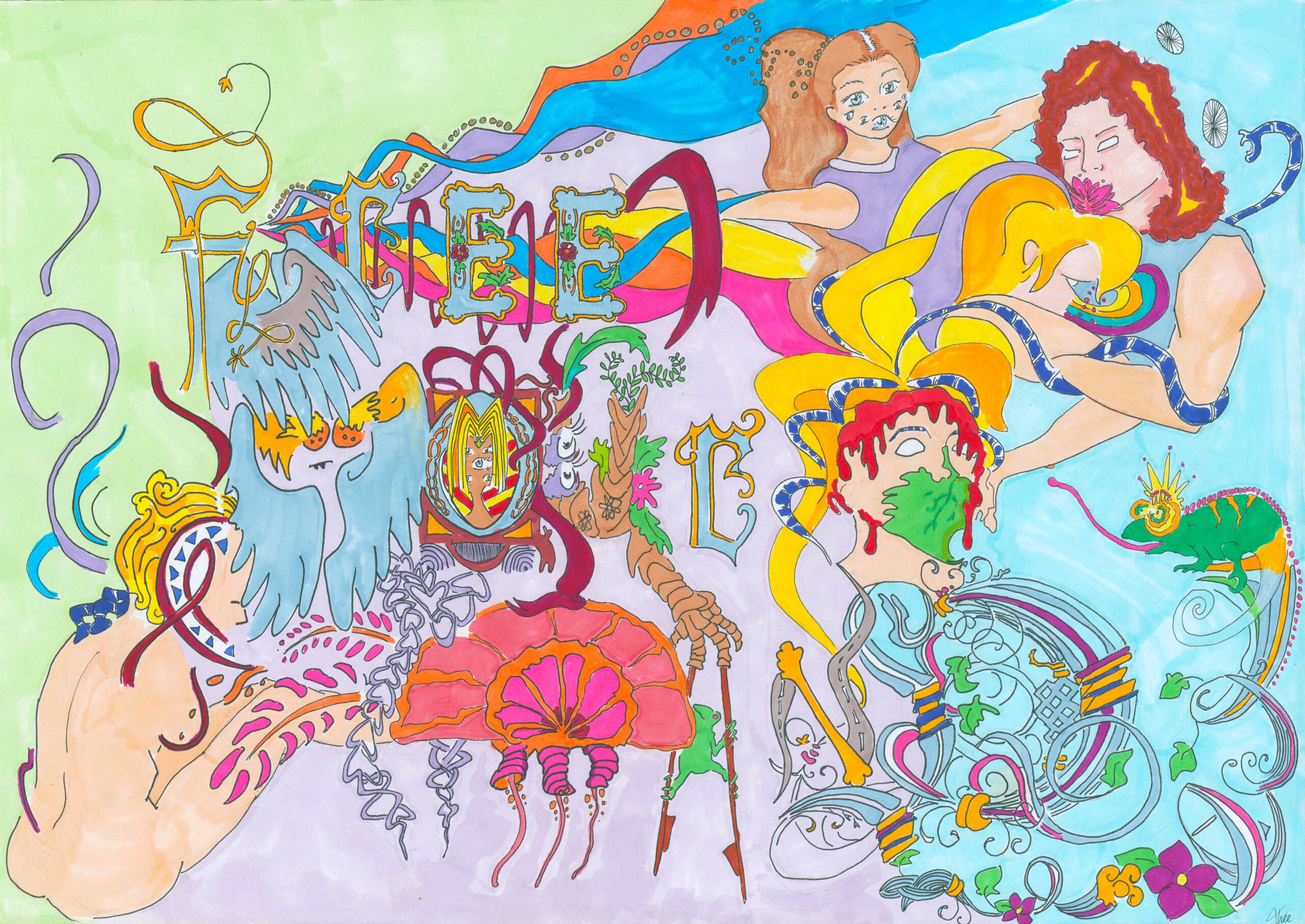 Dit kunstwerk symboliseert het leegmaken van je hoofd. Linksonder zie je iemand die in gedachten is. De gedachten om alle vanzelfsprekendheden-piekergedachten los te laten kan ‘mind blown’ zijn (zie ´M’). Dan sta je open voor nieuwe inzichten (zie kikker op stelten). Wanneer je een blad voor de mond hebt, kan dit leiden tot piekergedachten en moet je contact zoeken met de ander (rechtsboven) om meer te kunnen zien (zie afbeelding met meerdere ogen).
